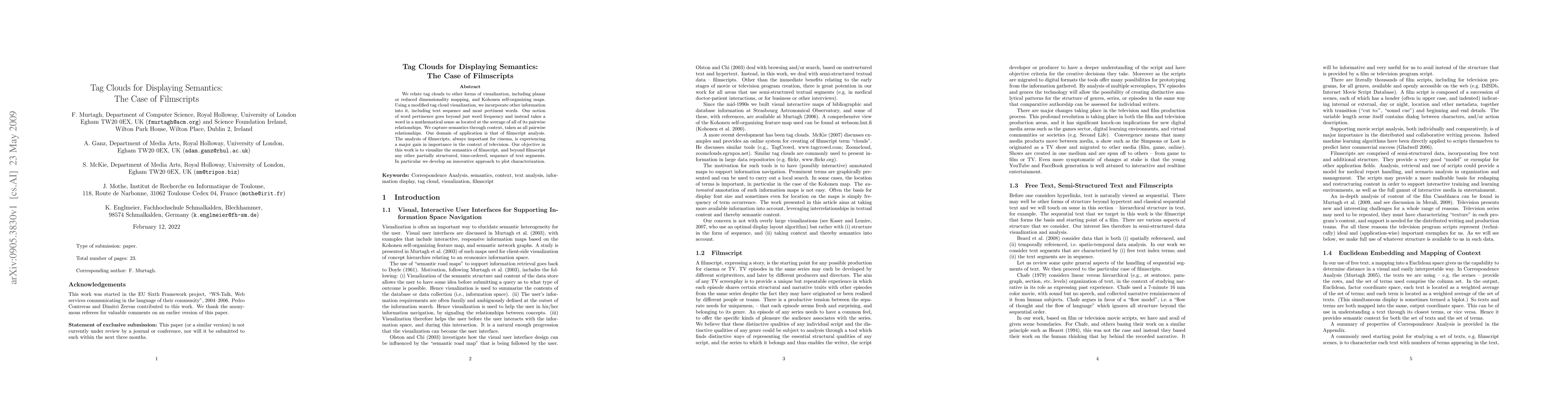 We relate tag clouds to other forms of visualization, including planar or reduced dimensionality mapping, and Kohonen self-organizing maps. Using a modified tag cloud visualization, we incorporate other information into it, including text sequence and most pertinent words. Our notion of word pertinence goes beyond just word frequency and instead takes a word in a mathematical sense as located at the average of all of its pairwise relationships. We capture semantics through context, taken as all pairwise relationships. Our domain of application is that of filmscript analysis. The analysis of filmscripts, always important for cinema, is experiencing a major gain in importance in the context of television. Our objective in this work is to visualize the semantics of filmscript, and beyond filmscript any other partially structured, time-ordered, sequence of text segments. In particular we develop an innovative approach to plot characterization.