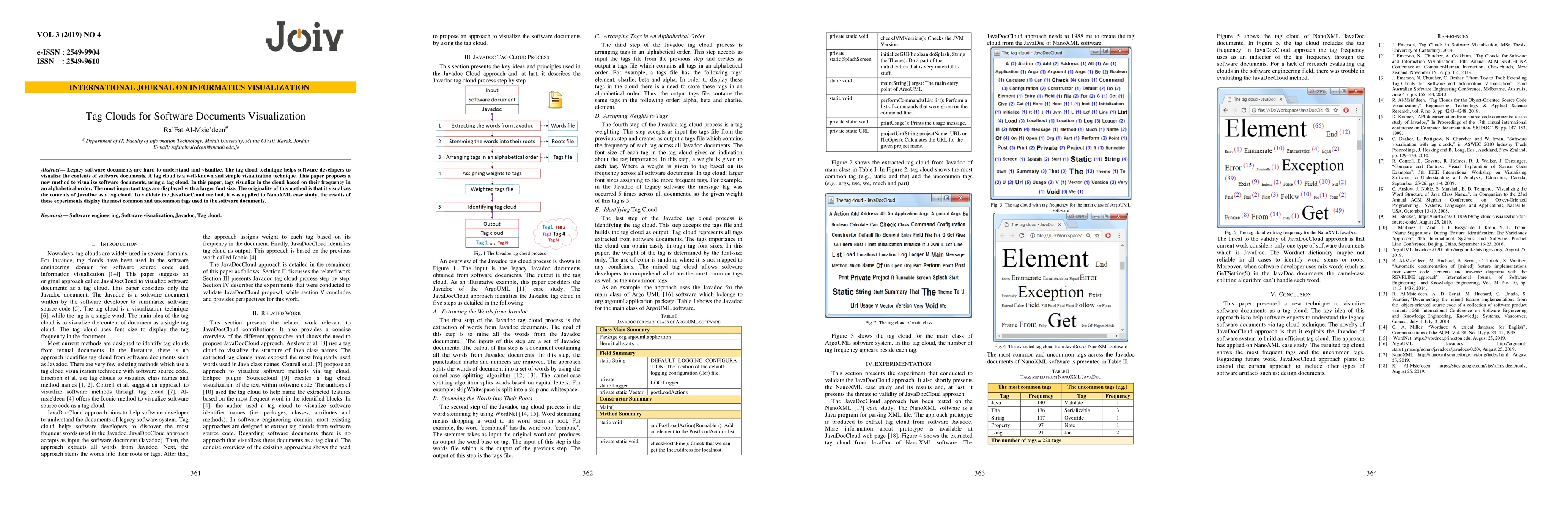 This paper proposes a new method to visualize software documents using a tag cloud, where tags are displayed based on their frequency and importance, with larger fonts for more significant tags. The method, called JavaDocCloud, was validated on NanoXML, showing common and uncommon tags in JavaDoc documentation.