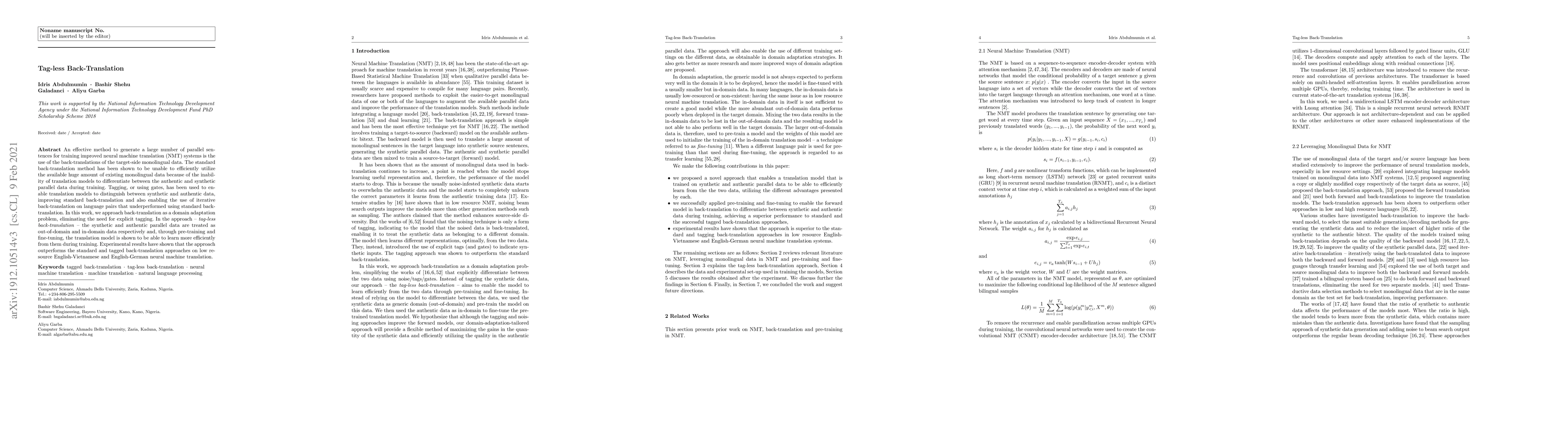 This paper proposes a tag-less back-translation method to efficiently utilize large monolingual datasets for neural machine translation (NMT). Unlike standard back-translation, it eliminates the need for tagging synthetic data by treating it as out-of-domain, leading to improved training efficiency and better performance on low-resource language pairs.