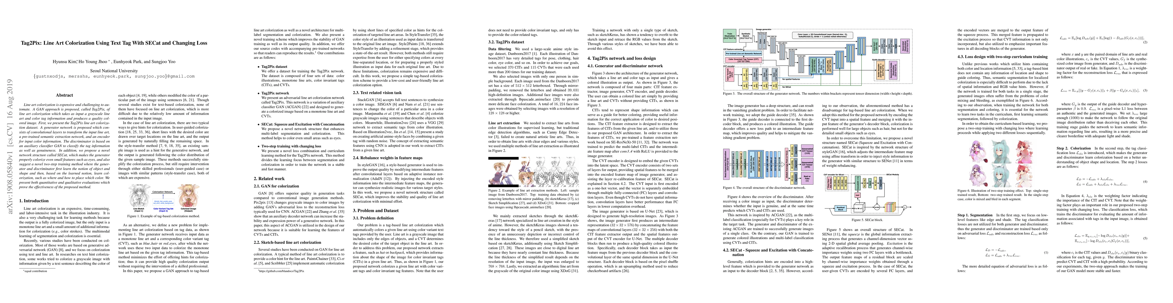 Line art colorization is expensive and challenging to automate. A GAN approach is proposed, called Tag2Pix, of line art colorization which takes as input a grayscale line art and color tag information and produces a quality colored image. First, we present the Tag2Pix line art colorization dataset. A generator network is proposed which consists of convolutional layers to transform the input line art, a pre-trained semantic extraction network, and an encoder for input color information. The discriminator is based on an auxiliary classifier GAN to classify the tag information as well as genuineness. In addition, we propose a novel network structure called SECat, which makes the generator properly colorize even small features such as eyes, and also suggest a novel two-step training method where the generator and discriminator first learn the notion of object and shape and then, based on the learned notion, learn colorization, such as where and how to place which color. We present both quantitative and qualitative evaluations which prove the effectiveness of the proposed method.