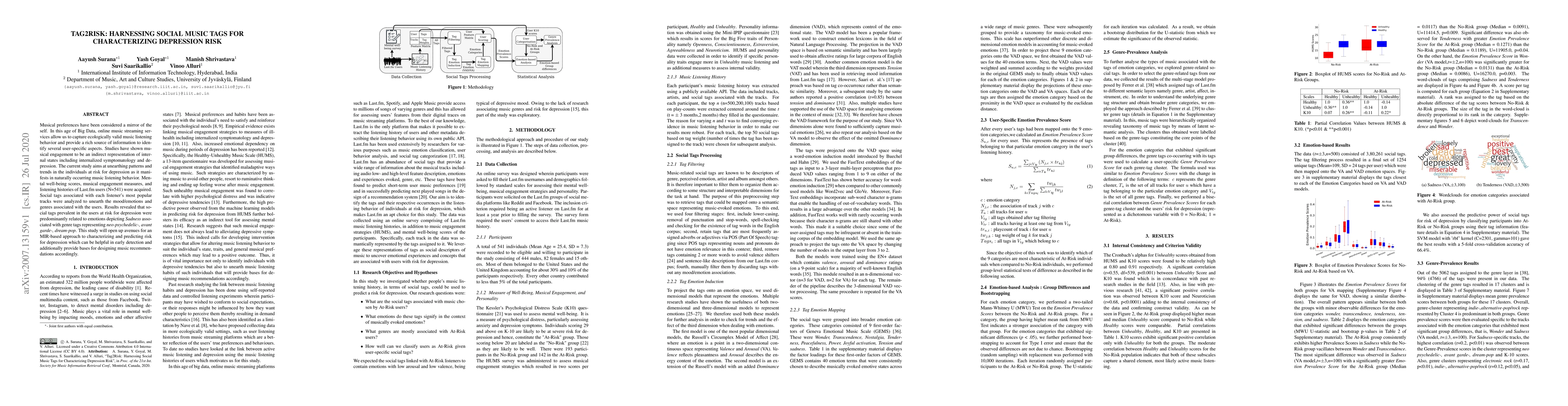 This study explores how social music tags on Last.fm can identify patterns linked to depression risk by analyzing mood and genre associations in users' listening behaviors. Results indicate that users at risk for depression predominantly engage with music tags related to sadness and specific genres like neo-psychedelic and avant garde.