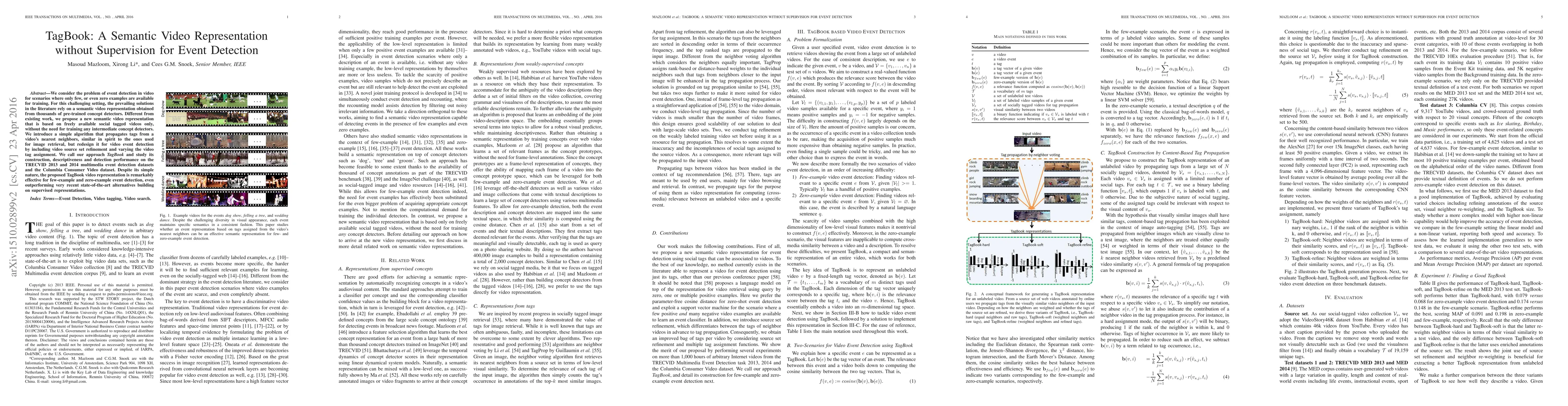 TagBook proposes a novel unsupervised semantic video representation derived from social tagged videos, achieving effective event detection without training intermediate concept detectors. Despite its simplicity, TagBook outperforms state-of-the-art supervised methods in few-example and zero-example event detection scenarios.