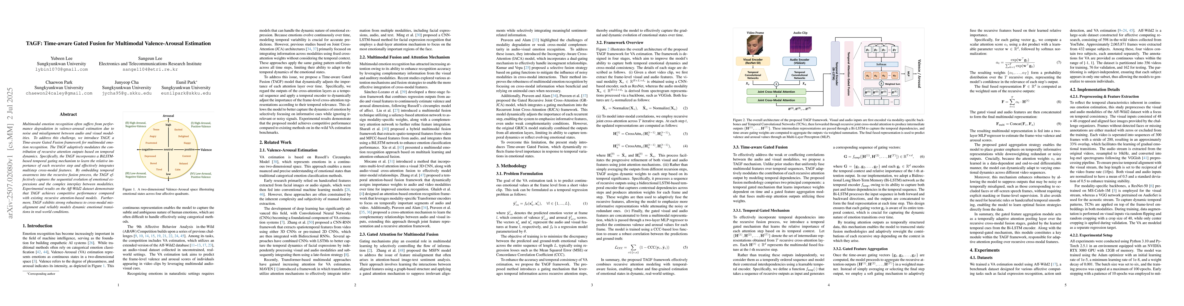 Multimodal emotion recognition often suffers from performance degradation in valence-arousal estimation due to noise and misalignment between audio and visual modalities. To address this challenge, we introduce TAGF, a Time-aware Gated Fusion framework for multimodal emotion recognition. The TAGF adaptively modulates the contribution of recursive attention outputs based on temporal dynamics. Specifically, the TAGF incorporates a BiLSTM-based temporal gating mechanism to learn the relative importance of each recursive step and effectively integrates multistep cross-modal features. By embedding temporal awareness into the recursive fusion process, the TAGF effectively captures the sequential evolution of emotional expressions and the complex interplay between modalities. Experimental results on the Aff-Wild2 dataset demonstrate that TAGF achieves competitive performance compared with existing recursive attention-based models. Furthermore, TAGF exhibits strong robustness to cross-modal misalignment and reliably models dynamic emotional transitions in real-world conditions.