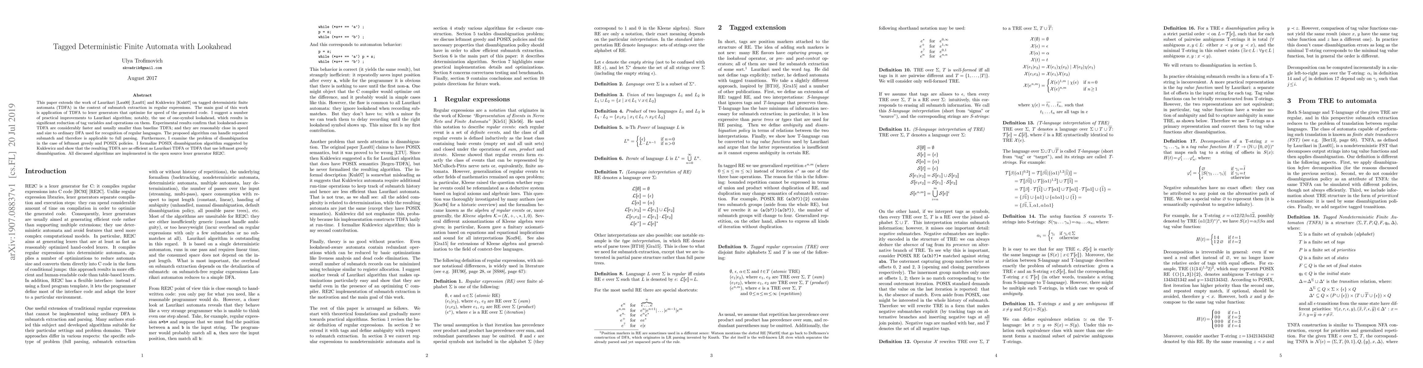 This paper extends the work of Laurikari and Kuklewicz on tagged deterministic finite automata (TDFA) in the context of submatch extraction in regular expressions. The main goal of this work is application of TDFA to lexer generators that optimize for speed of the generated code. I suggest a number of practical improvements to Laurikari algorithm; notably, the use of one-symbol lookahead, which results in significant reduction of tag variables and operations on them. Experimental results confirm that lookahead-aware TDFA are considerably faster and usually smaller than baseline TDFA; and they are reasonably close in speed and size to ordinary DFA used for recognition of regular languages. The proposed algorithm can handle repeated submatch and therefore is applicable to full parsing. Furthermore, I examine the problem of disambiguation in the case of leftmost greedy and POSIX policies. I formalize POSIX disambiguation algorithm suggested by Kuklewicz and show that the resulting TDFA are as efficient as Laurikari TDFA or TDFA that use leftmost greedy disambiguation. All discussed algorithms are implemented in the open source lexer generator RE2C.