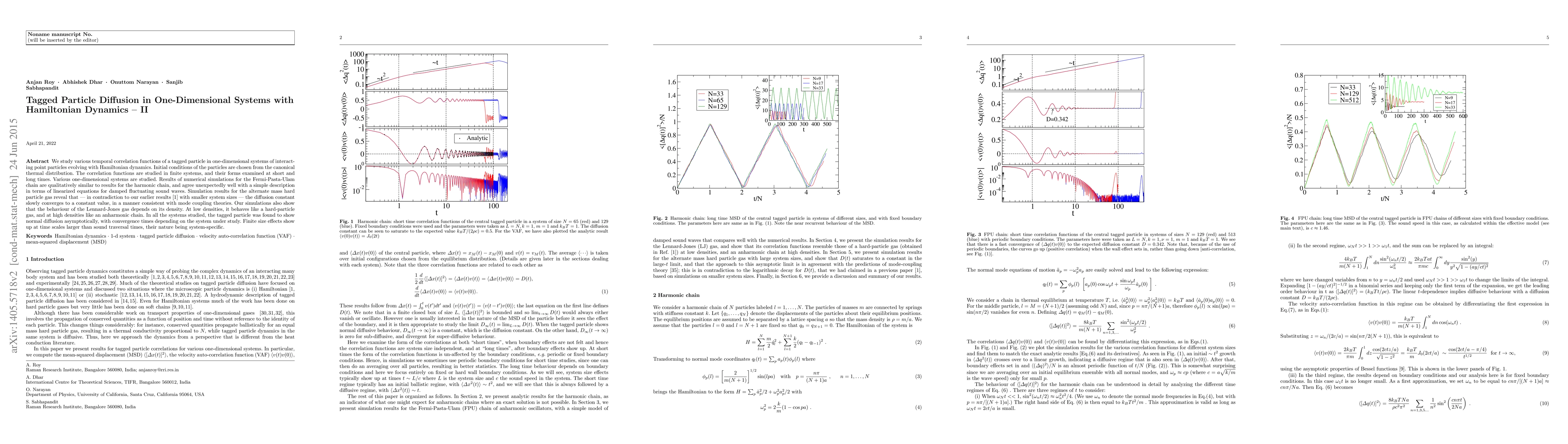 This paper investigates temporal correlation functions of tagged particles in one-dimensional Hamiltonian systems, finding that Fermi-Pasta-Ulam chain dynamics align with linearized sound wave models. Contrary to previous results, the alternate mass hard particle gas shows a diffusion constant converging to a constant value, consistent with mode coupling theories.