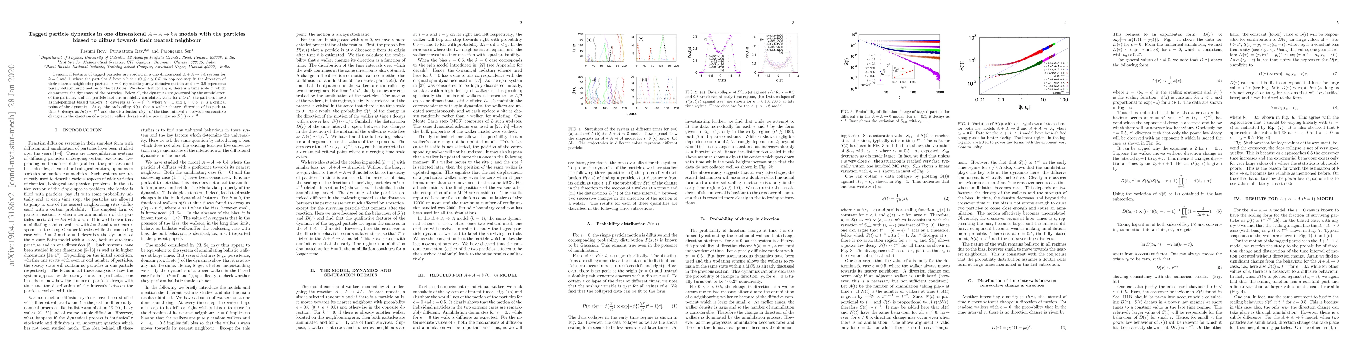 Dynamical features of tagged particles are studied in a one dimensional $A+A \rightarrow kA$ system for $k=0$ and 1, where the particles $A$ have a bias $\epsilon$ $(0 \leq \epsilon \leq 0.5)$ to hop one step in the direction of their nearest neighboring particle. $\epsilon=0$ represents purely diffusive motion and $\epsilon=0.5$ represents purely deterministic motion of the particles. We show that for any $\epsilon$, there is a time scale $t^*$ which demarcates the dynamics of the particles. Below $t^*$, the dynamics are governed by the annihilation of the particles, and the particle motions are highly correlated, while for $t \gg t^*$, the particles move as independent biased walkers. $t^*$ diverges as $(\epsilon_c-\epsilon)^{-\gamma}$, where $\gamma=1$ and $\epsilon_c =0.5$. $\epsilon_c$ is a critical point of the dynamics. At $\epsilon_c$, the probability $S(t)$, that a walker changes direction of its path at time $t$, decays as $S(t) \sim t^{-1}$ and the distribution $D(\tau)$ of the time interval $\tau$ between consecutive changes in the direction of a typical walker decays with a power law as $D(\tau) \sim \tau^{-2}$.