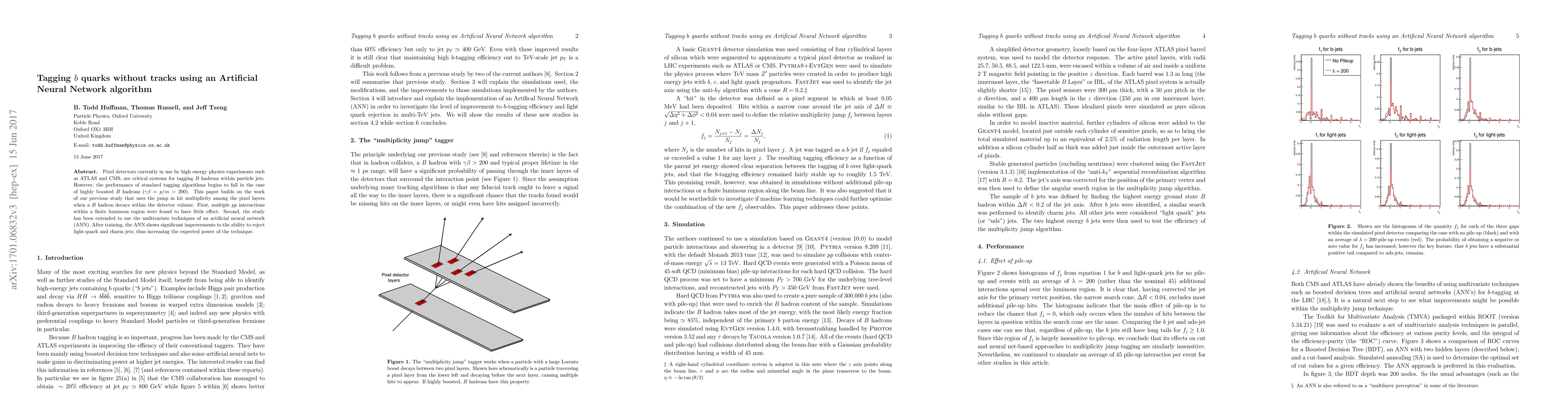 Pixel detectors currently in use by high energy physics experiments such as ATLAS, CMS, LHCb, etc., are critical systems for tagging $B$ hadrons within particle jets. However, the performance of standard tagging algorithms begins to fall in the case of highly boosted $B$ hadrons ($\gamma \beta = p/m >200$). This paper builds on the work of our previous study that uses the jump in hit multiplicity among the pixel layers when a $B$ hadron decays within the detector volume. First, multiple $pp$ interactions within a finite luminous region were found to have little effect. Second, the study has been extended to use the multivariant techniques of an artificial neural network (ANN). After training, the ANN shows significant improvements to the ability to reject light-quark and charm jets; thus increasing the expected significance of the technique.