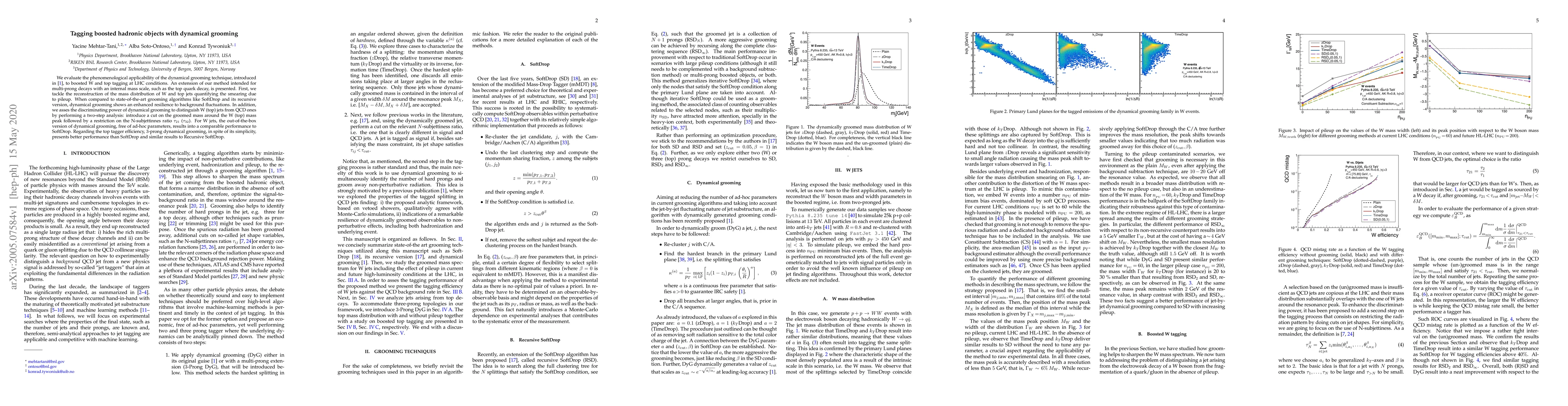The paper evaluates a dynamical grooming technique for boosted W and top tagging at LHC conditions, showing improved resilience to background fluctuations and comparable performance to state-of-the-art algorithms.