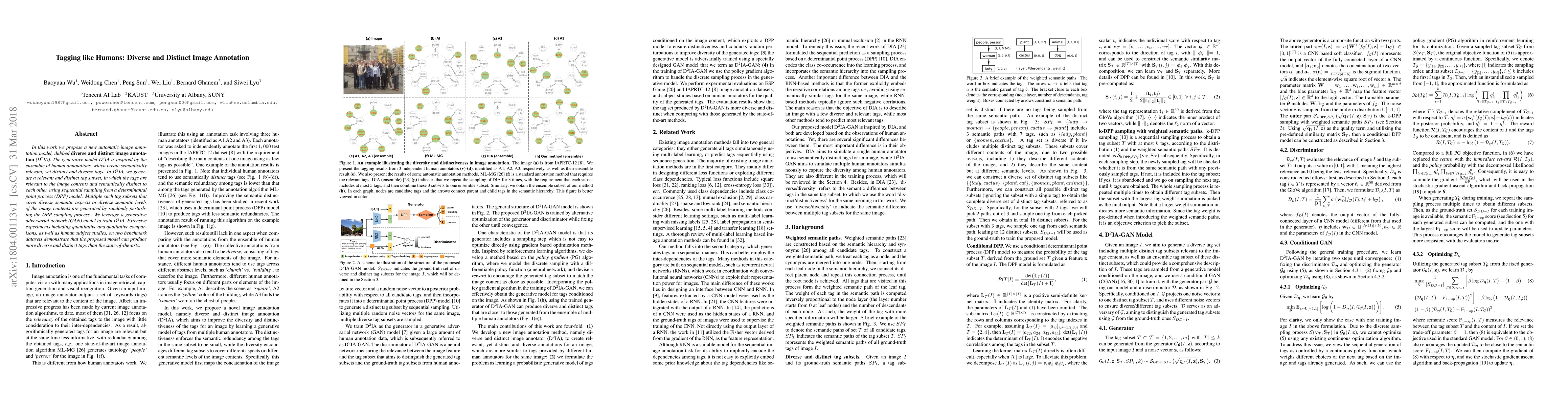 In this work we propose a new automatic image annotation model, dubbed {\bf diverse and distinct image annotation} (D2IA). The generative model D2IA is inspired by the ensemble of human annotations, which create semantically relevant, yet distinct and diverse tags. In D2IA, we generate a relevant and distinct tag subset, in which the tags are relevant to the image contents and semantically distinct to each other, using sequential sampling from a determinantal point process (DPP) model. Multiple such tag subsets that cover diverse semantic aspects or diverse semantic levels of the image contents are generated by randomly perturbing the DPP sampling process. We leverage a generative adversarial network (GAN) model to train D2IA. Extensive experiments including quantitative and qualitative comparisons, as well as human subject studies, on two benchmark datasets demonstrate that the proposed model can produce more diverse and distinct tags than the state-of-the-arts.