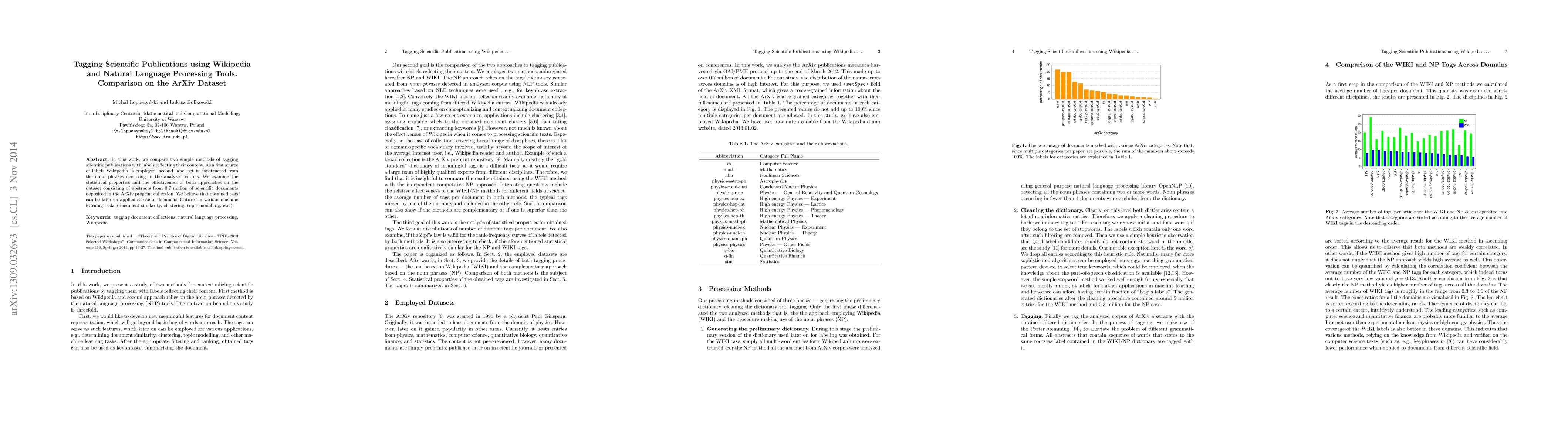 In this work, we compare two simple methods of tagging scientific publications with labels reflecting their content. As a first source of labels Wikipedia is employed, second label set is constructed from the noun phrases occurring in the analyzed corpus. We examine the statistical properties and the effectiveness of both approaches on the dataset consisting of abstracts from 0.7 million of scientific documents deposited in the ArXiv preprint collection. We believe that obtained tags can be later on applied as useful document features in various machine learning tasks (document similarity, clustering, topic modelling, etc.).