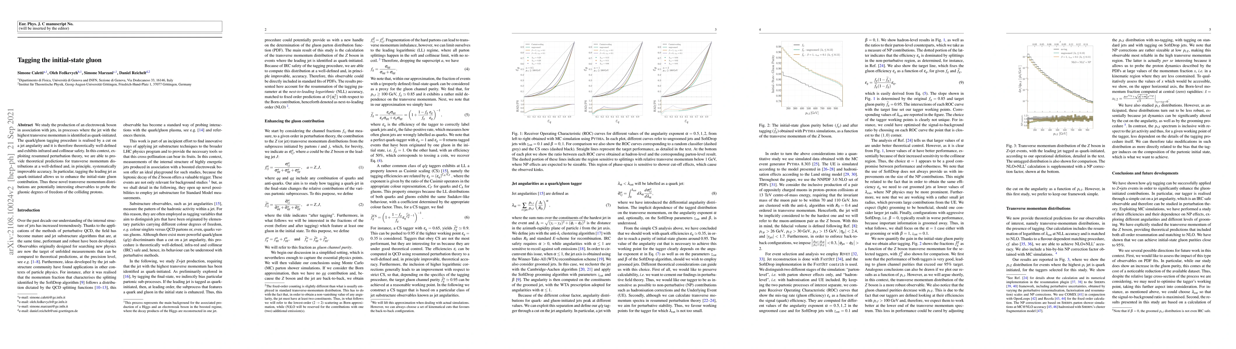 We study the production of an electroweak boson in association with jets, in processes where the jet with the highest transverse momentum is identified as quark-initiated. The quark/gluon tagging procedure is realised by a cut on a jet angularity and it is therefore theoretically well-defined and exhibits infrared and collinear safety. In this context, exploiting resummed perturbation theory, we are able to provide theoretical predictions for transverse momentum distributions at a well-defined and, in principle, systematically improvable accuracy. In particular, tagging the leading jet as quark-initiated allows us to enhance the initial-state gluon contribution. Thus, these novel transverse momentum distributions are potentially interesting observables to probe the gluonic degrees of freedom of the colliding protons.