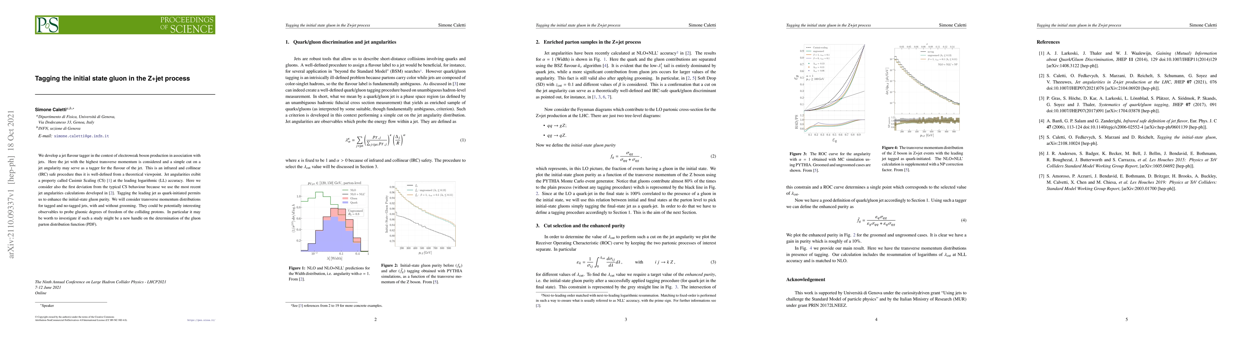 We develop a jet flavour tagger in the contest of electroweak boson production in association with jets. Here the jet with the highest transverse momentum is considered and a simple cut on a jet angularity may serve as a tagger for the flavour of the jet. This is an infrared and collinear (IRC) safe procedure thus it is well-defined from a theoretical viewpoint. Jet angularities exibit a property called Casimir Scaling (CS) at the leading logarithmic (LL) accuracy. Here we consider also the first deviation from the typical CS behaviour because we use the most recent jet angularities calculations. Tagging the leading jet as quark-initiated permits us to enhance the initial-state gluon purity. We will consider transverse momentum distributions for tagged and no-tagged jets, with and without grooming. They could be potentially interesting observables to probe gluonic degrees of freedom of the colliding protons. In particular it may be worth to investigate if such a study might be a new handle on the determination of the gluon parton distribution function (PDF).