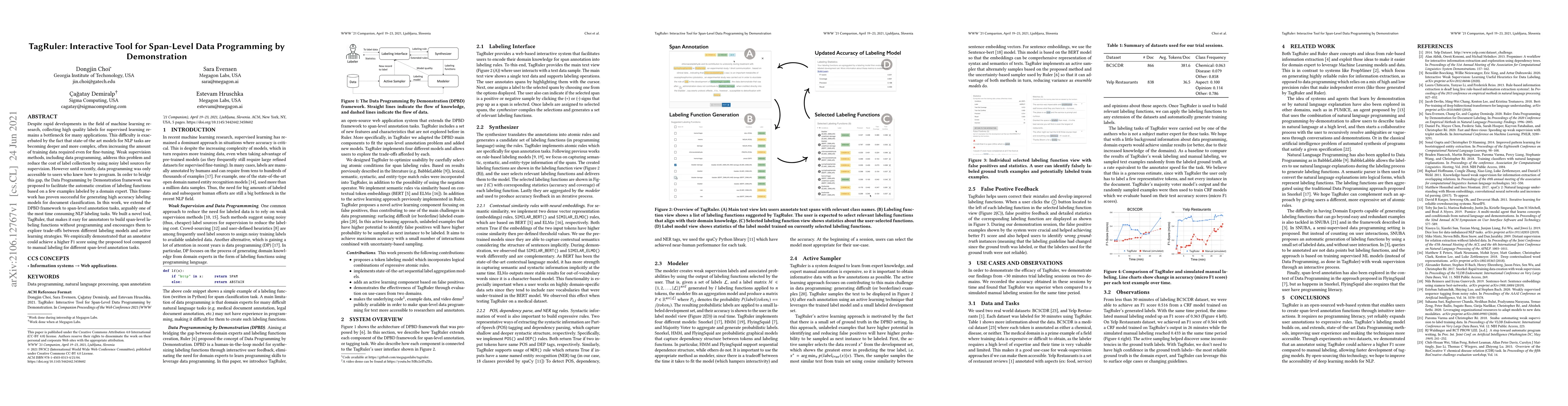 Despite rapid developments in the field of machine learning research, collecting high-quality labels for supervised learning remains a bottleneck for many applications. This difficulty is exacerbated by the fact that state-of-the-art models for NLP tasks are becoming deeper and more complex, often increasing the amount of training data required even for fine-tuning. Weak supervision methods, including data programming, address this problem and reduce the cost of label collection by using noisy label sources for supervision. However, until recently, data programming was only accessible to users who knew how to program. To bridge this gap, the Data Programming by Demonstration framework was proposed to facilitate the automatic creation of labeling functions based on a few examples labeled by a domain expert. This framework has proven successful for generating high-accuracy labeling models for document classification. In this work, we extend the DPBD framework to span-level annotation tasks, arguably one of the most time-consuming NLP labeling tasks. We built a novel tool, TagRuler, that makes it easy for annotators to build span-level labeling functions without programming and encourages them to explore trade-offs between different labeling models and active learning strategies. We empirically demonstrated that an annotator could achieve a higher F1 score using the proposed tool compared to manual labeling for different span-level annotation tasks.