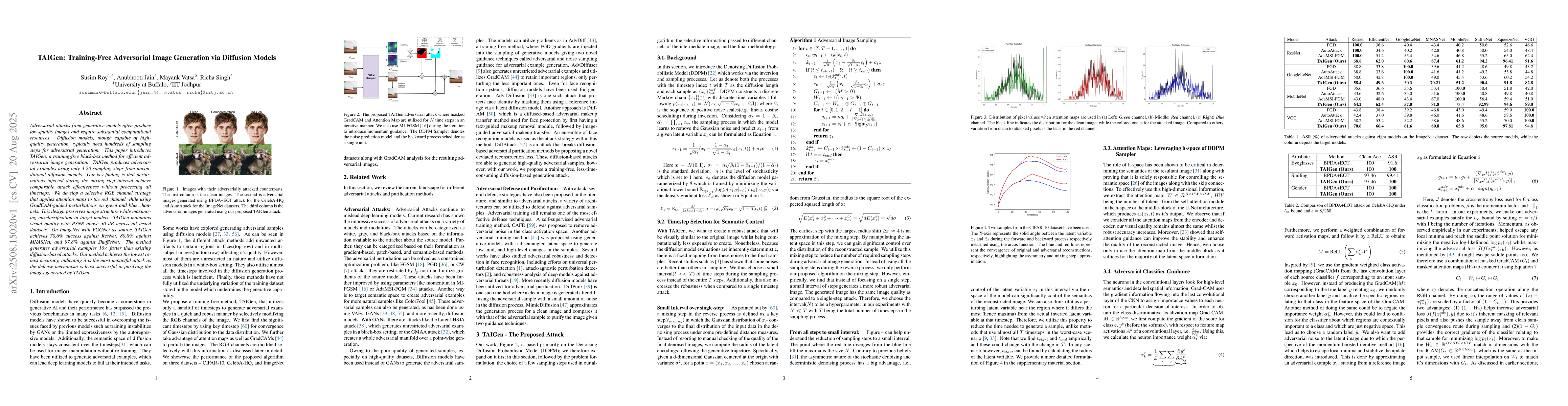 Adversarial attacks from generative models often produce low-quality images and require substantial computational resources. Diffusion models, though capable of high-quality generation, typically need hundreds of sampling steps for adversarial generation. This paper introduces TAIGen, a training-free black-box method for efficient adversarial image generation. TAIGen produces adversarial examples using only 3-20 sampling steps from unconditional diffusion models. Our key finding is that perturbations injected during the mixing step interval achieve comparable attack effectiveness without processing all timesteps. We develop a selective RGB channel strategy that applies attention maps to the red channel while using GradCAM-guided perturbations on green and blue channels. This design preserves image structure while maximizing misclassification in target models. TAIGen maintains visual quality with PSNR above 30 dB across all tested datasets. On ImageNet with VGGNet as source, TAIGen achieves 70.6% success against ResNet, 80.8% against MNASNet, and 97.8% against ShuffleNet. The method generates adversarial examples 10x faster than existing diffusion-based attacks. Our method achieves the lowest robust accuracy, indicating it is the most impactful attack as the defense mechanism is least successful in purifying the images generated by TAIGen.