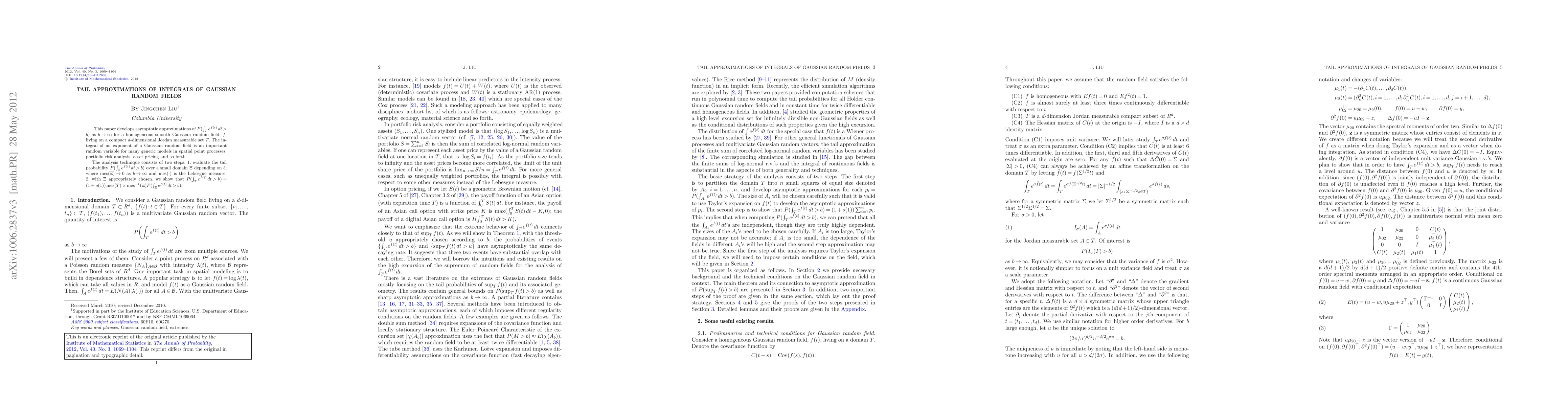 This paper provides asymptotic approximations for the tail probability of integrals of Gaussian random fields as the threshold approaches infinity. The analysis involves evaluating the tail probability over a shrinking domain and demonstrating that the overall tail probability scales with the measure of the larger domain.