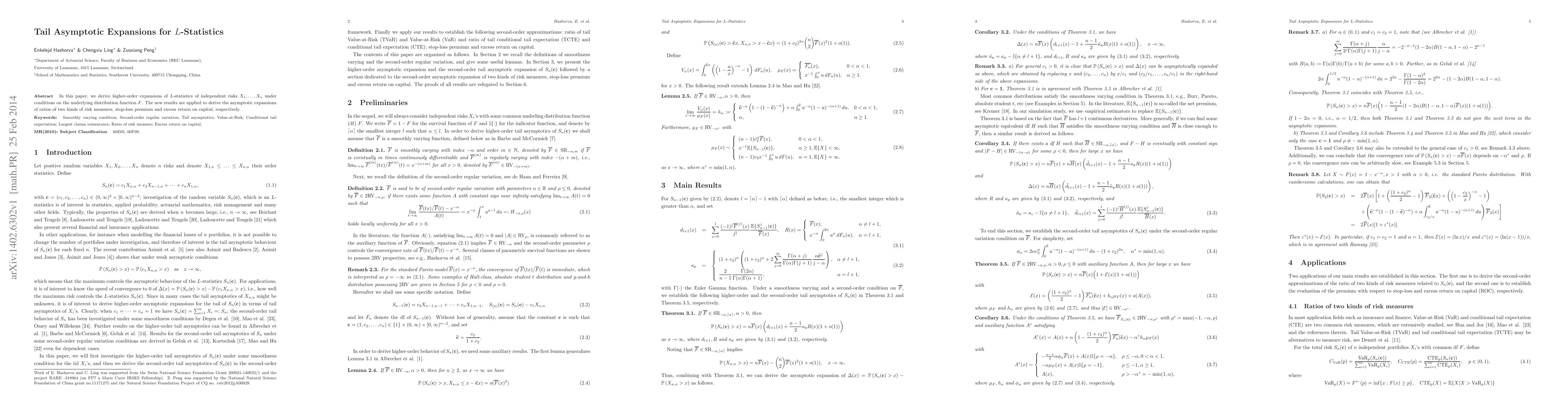This paper develops higher-order asymptotic expansions for $L$-statistics of independent risks, applying these results to derive expansions for stop-loss premium and excess return on capital ratios, under specified distribution conditions.