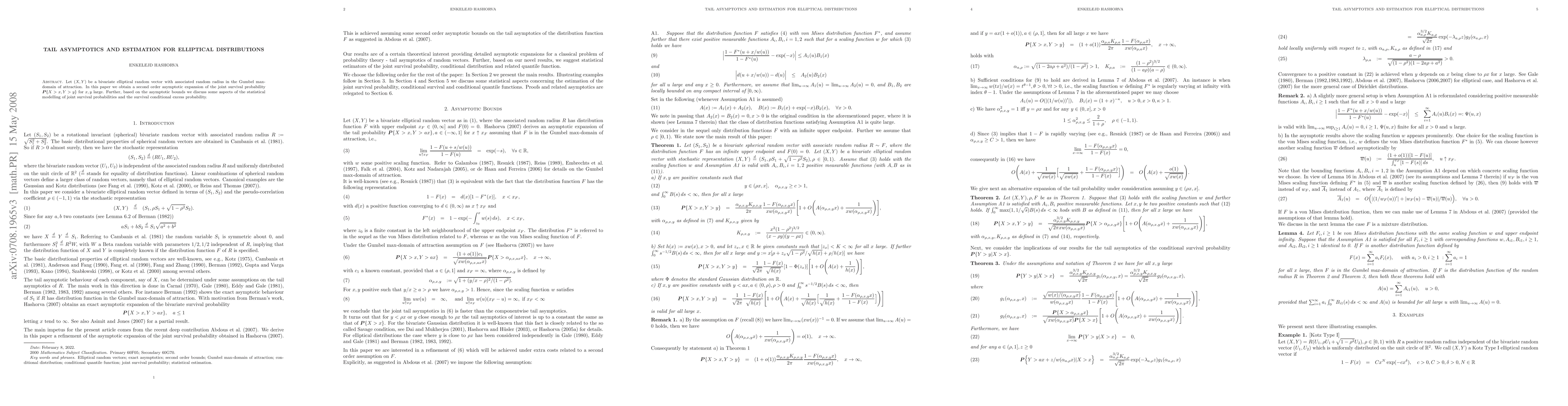 Let (X,Y) be a bivariate elliptical random vector with associated random radius in the Gumbel max-domain of attraction. In this paper we obtain a second order asymptotic expansion of the joint survival probability P(X > x, Y> y) for x,y large. Further, based on the asymptotic bounds we discuss some aspects of the statistical modelling of joint survival probabilities and the survival conditional excess probability.
