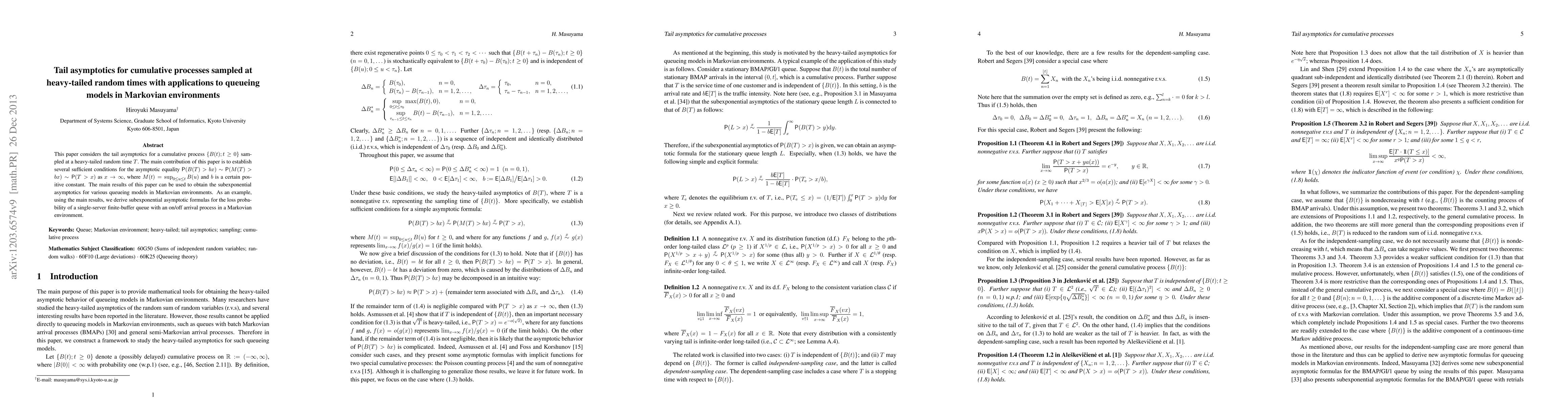 This paper establishes sufficient conditions for tail asymptotics of cumulative processes sampled at heavy-tailed random times, showing ${\sf P}(B(T) > bx) \sim {\sf P}(T>x)$ as $x \to \infty$ and applies these results to derive subexponential asymptotics for queueing models in Markovian environments, including the loss probability for a finite-buffer queue with an on/off arrival process.