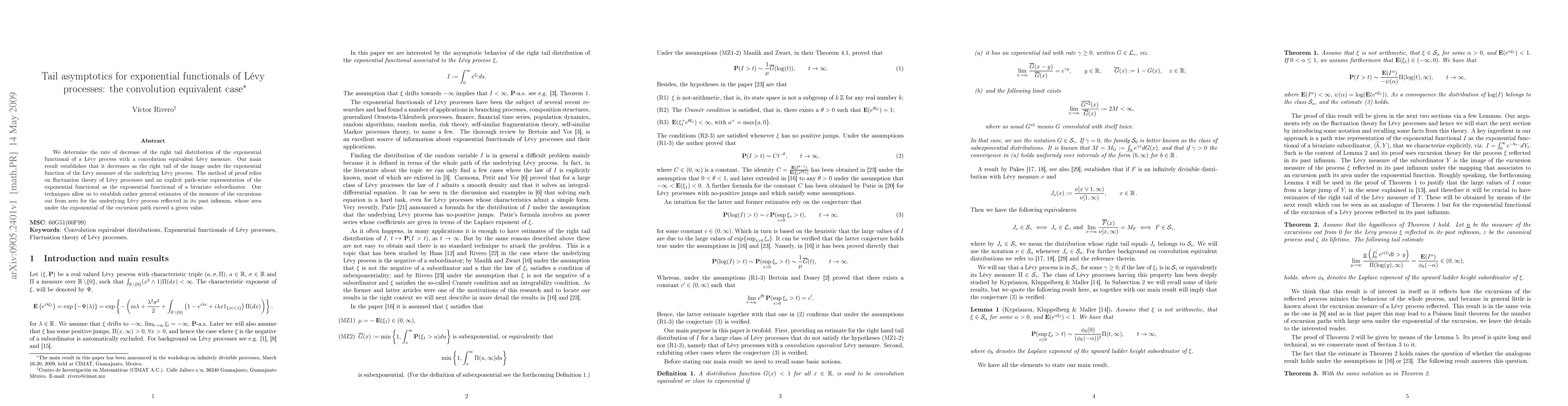 This paper investigates the tail behavior of exponential functionals of Lévy processes with convolution equivalent Lévy measures, showing that the right tail decreases at a rate determined by the exponential image of the Lévy measure. The proof leverages fluctuation theory and a path-wise representation of the functional as an exponential functional of a bivariate subordinator.