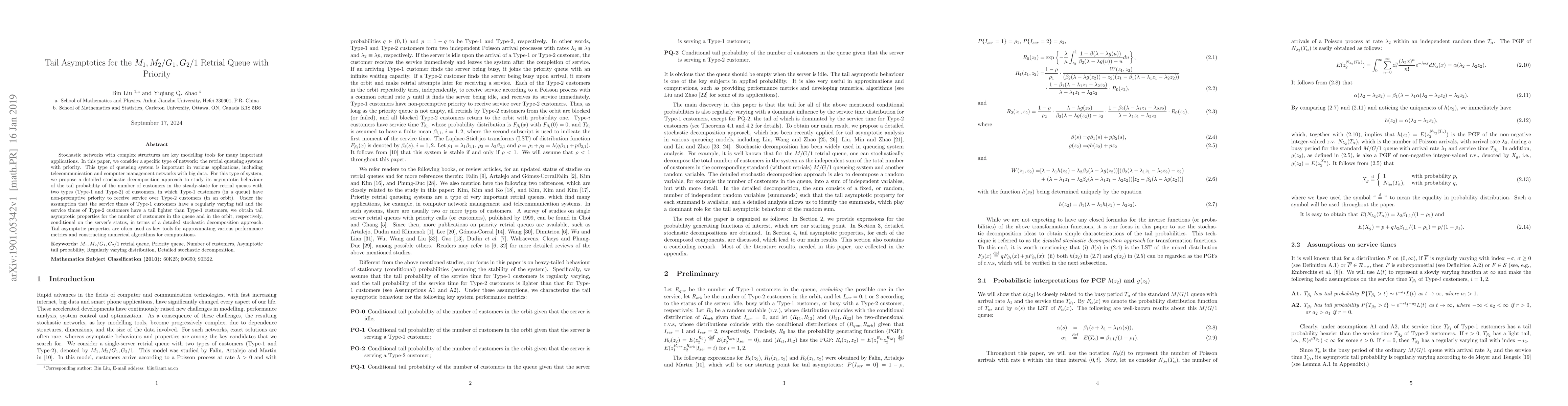Stochastic networks with complex structures are key modelling tools for many important applications. In this paper, we consider a specific type of network: the retrial queueing systems with priority. This type of queueing system is important in various applications, including telecommunication and computer management networks with big data. For this type of system, we propose a detailed stochastic decomposition approach to study its asymptotic behaviour of the tail probability of the number of customers in the steady-state for retrial queues with two types (Type-1 and Type-2) of customers, in which Type-1 customers (in a queue) have non-preemptive priority to receive service over Type-2 customers (in an orbit). Under the assumption that the service times of Type-1 customers have a regularly varying tail and the service times of Type-2 customers have a tail lighter than Type-1 customers, we obtain tail asymptotic properties for the number of customers in the queue and in the orbit, respectively, conditional on the server's status, in terms of a detailed stochastic decomposition approach. Tail asymptotic properties are often used as key tools for approximating various performance metrics and constructing numerical algorithms for computations.