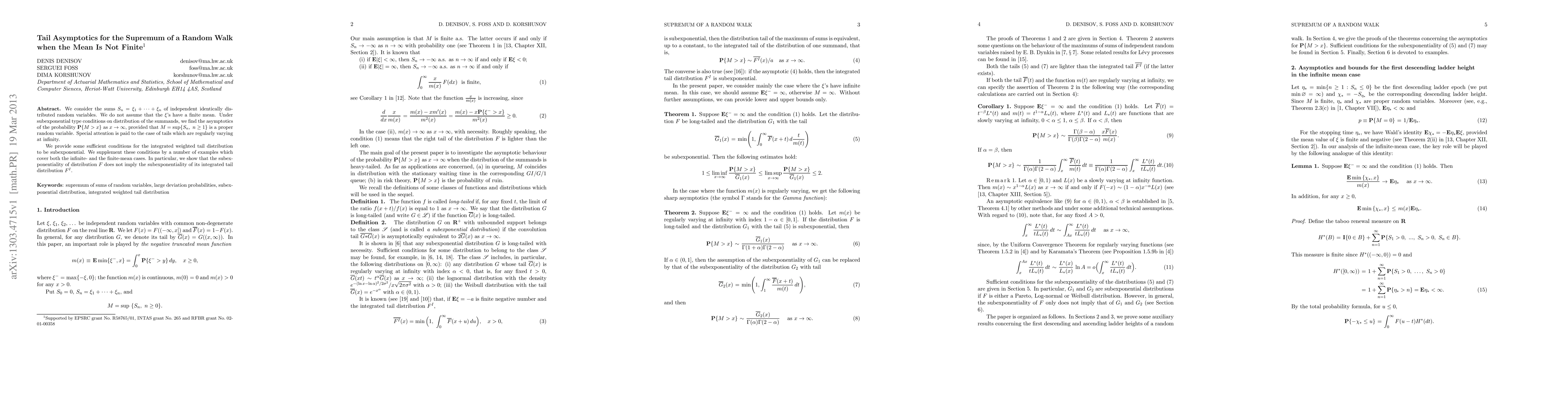 This paper investigates the tail asymptotics of the supremum of a random walk where the mean of the summands is not finite. It finds the asymptotic behavior of the probability that the supremum exceeds a large value under subexponential conditions, highlighting the distinction between the distribution and its integrated tail distribution.