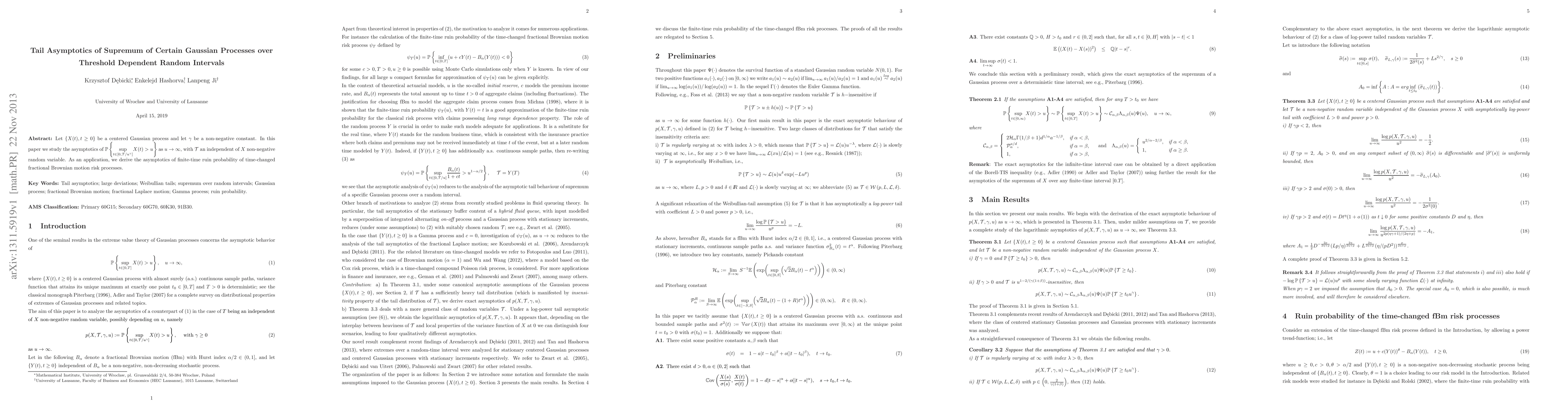 Let $\{X(t),t\ge0\}$ be a centered Gaussian process and let $\gamma$ be a non-negative constant. In this paper we study the asymptotics of $P\{\underset{t\in [0,\mathcal{T}/u^\gamma]}\sup X(t)>u\}$ as $u\to\infty$, with $\mathcal{T}$ an independent of $X$ non-negative random variable. As an application, we derive the asymptotics of finite-time ruin probability of time-changed fractional Brownian motion risk processes.