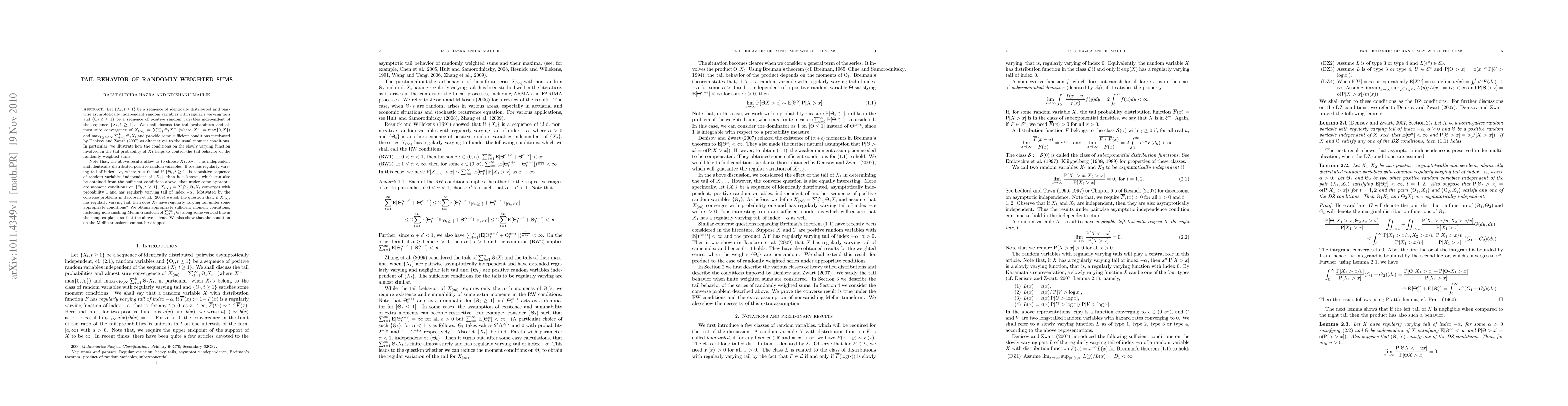 This paper explores the tail behavior of randomly weighted sums of independent, identically distributed random variables with regularly varying tails. It provides sufficient conditions for almost sure convergence and tail behavior, focusing on the role of slowly varying functions and the Mellin transform, and addresses the converse problem of determining tail behavior of the original variables given the tail behavior of the sums.