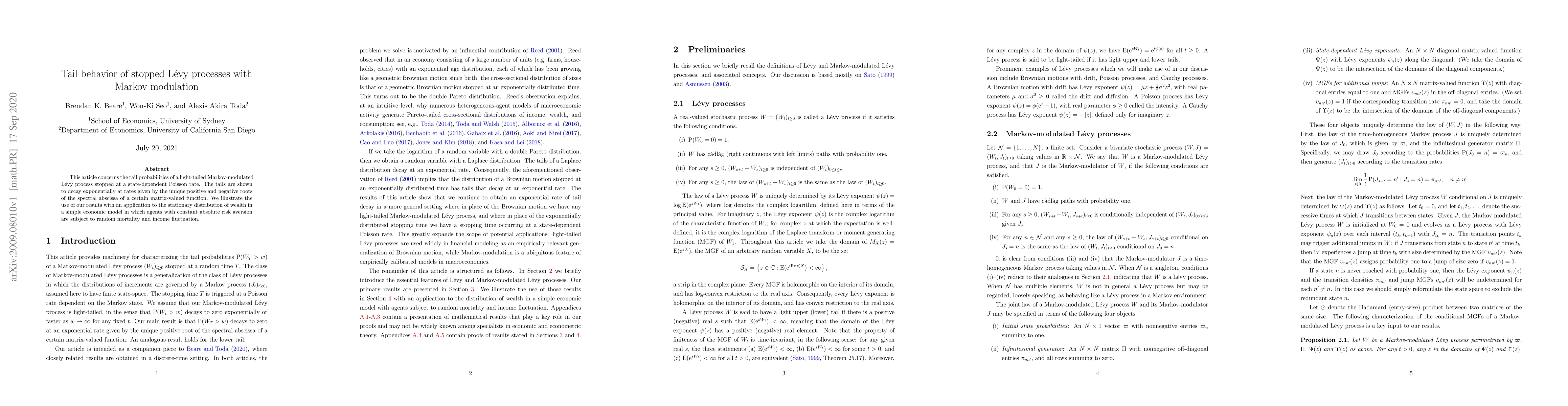 This article concerns the tail probabilities of a light-tailed Markov-modulated L\'evy process stopped at a state-dependent Poisson rate. The tails are shown to decay exponentially at rates given by the unique positive and negative roots of the spectral abscissa of a certain matrix-valued function. We illustrate the use of our results with an application to the stationary distribution of wealth in a simple economic model in which agents with constant absolute risk aversion are subject to random mortality and income fluctuation.