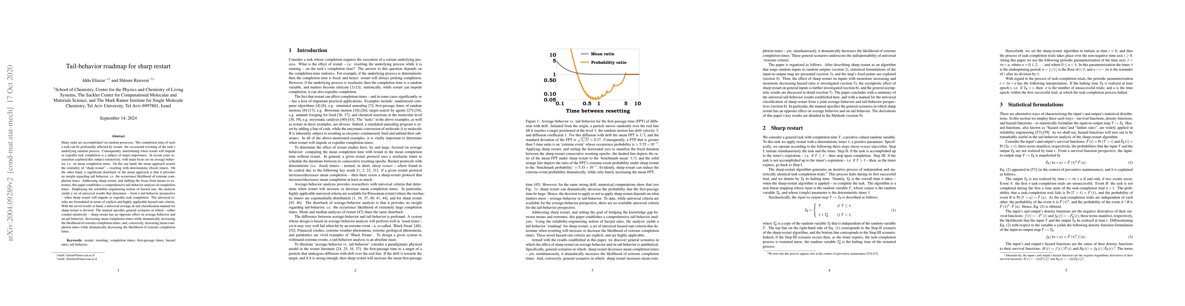 Many tasks are accomplished via random processes. The completion time of such a task can be profoundly affected by restart: the occasional resetting of the task's underlying random process. Consequently, determining when restart will impede or expedite task completion is a subject of major importance. In recent years researchers explored this subject extensively, with main focus set on average behavior, i.e. on mean completion times. On the one hand, the mean approach asserts the centrality of "sharp restart" -- resetting with deterministic (fixed) timers. On the other hand, a significant drawback of the mean approach is that it provides no insight regarding tail behavior, i.e. the occurrence likelihood of extreme completion times. Addressing sharp restart, and shifting the focus from means to extremes, this paper establishes a comprehensive tail-behavior analysis of completion times. Employing the reliability-engineering notion of hazard rate, the analysis yields a set of universal results that determine -- from a tail-behavior perspective -- when sharp restart will impede or expedite task completion. The universal results are formulated in terms of explicit and highly applicable hazard-rate criteria. With the novel results at hand, a universal average-&-tail classification manual for sharp restart is devised. The manual specifies general scenarios in which -- rather counter-intuitively -- sharp restart has an opposite effect on average behavior and on tail behavior: decreasing mean completion times while dramatically increasing the likelihood of extreme completion times; and, conversely, increasing mean completion times while dramatically decreasing the likelihood of extreme completion times.