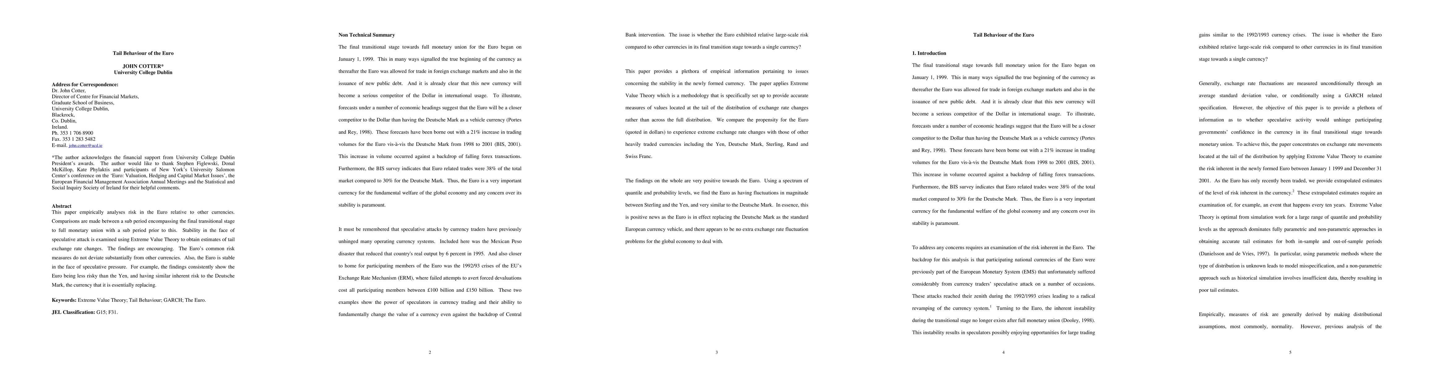 This paper empirically analyses risk in the Euro relative to other currencies. Comparisons are made between a sub period encompassing the final transitional stage to full monetary union with a sub period prior to this. Stability in the face of speculative attack is examined using Extreme Value Theory to obtain estimates of tail exchange rate changes. The findings are encouraging. The Euro's common risk measures do not deviate substantially from other currencies. Also, the Euro is stable in the face of speculative pressure. For example, the findings consistently show the Euro being less risky than the Yen, and having similar inherent risk to the Deutsche Mark, the currency that it is essentially replacing.