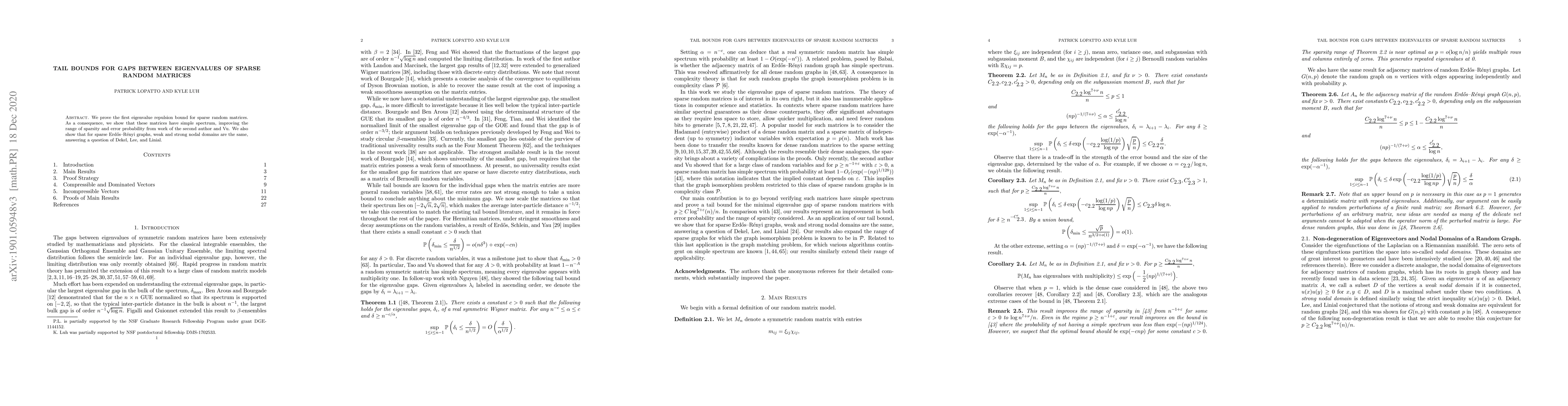 This paper establishes the first eigenvalue repulsion bound for sparse random matrices, demonstrating that they possess simple spectra with improved sparsity and error probabilities. It also shows that for sparse Erdős-Rényi graphs, weak and strong nodal domains coincide, resolving a question posed by Dekel, Lee, and Linial.