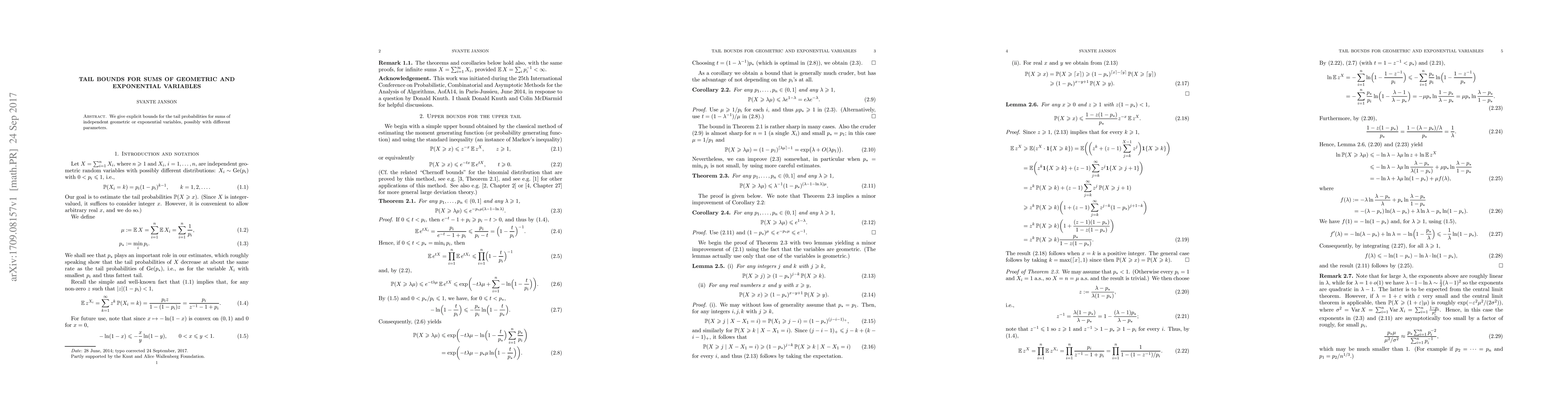 Summary: This paper provides explicit tail bounds for the sums of independent geometric or exponential variables, each potentially having different parameters, enhancing our understanding of their probabilistic behavior.