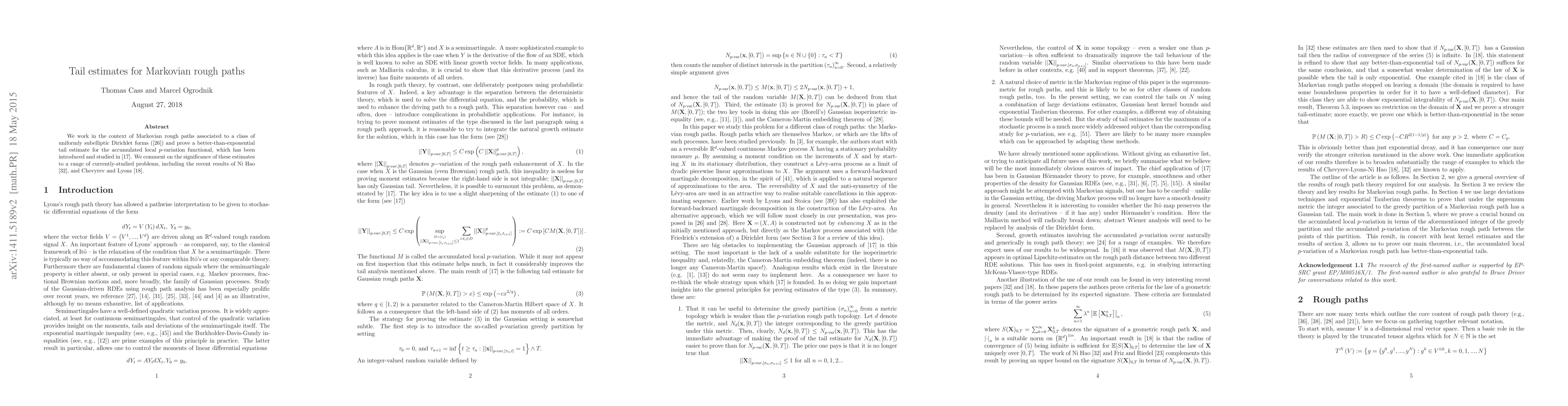 We work in the context of Markovian rough paths associated to a class of uniformly subelliptic Dirichlet forms [25] and prove a better-than-exponential tail estimate for the accummulated local p-variation functional, which has been introduced and studied in [17]. We comment on the significance of these estimates to a range of currently-studied problems, including the recent results of Chevyrev and Lyons in [18].