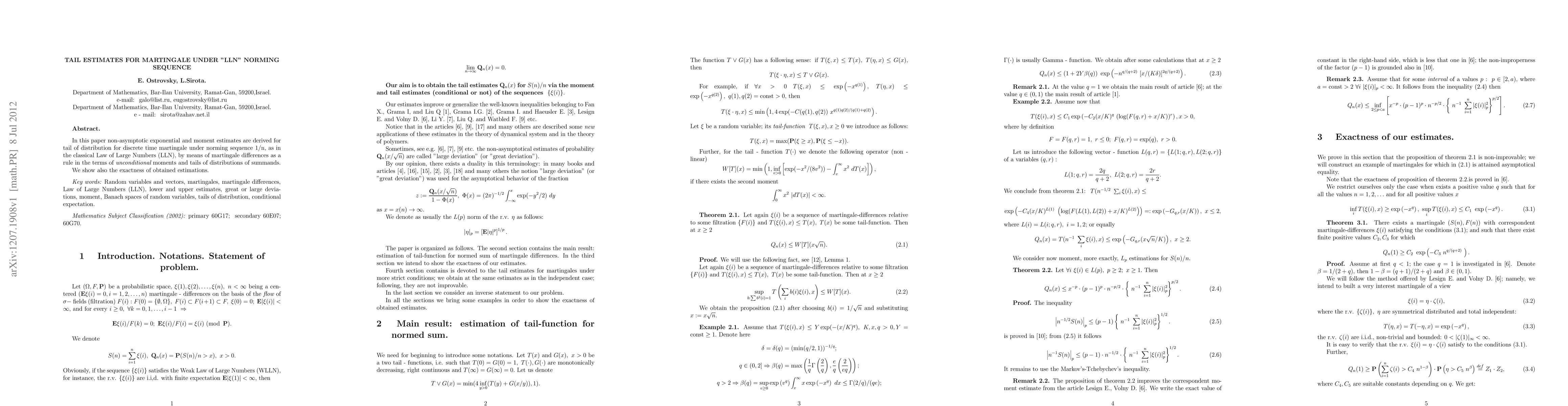 This paper derives non-asymptotic exponential and moment estimates for the tail distribution of a discrete-time martingale under the classical LLN norming sequence 1/n, using martingale differences and unconditional moments of summands. The study also demonstrates the exactness of the obtained estimations.
