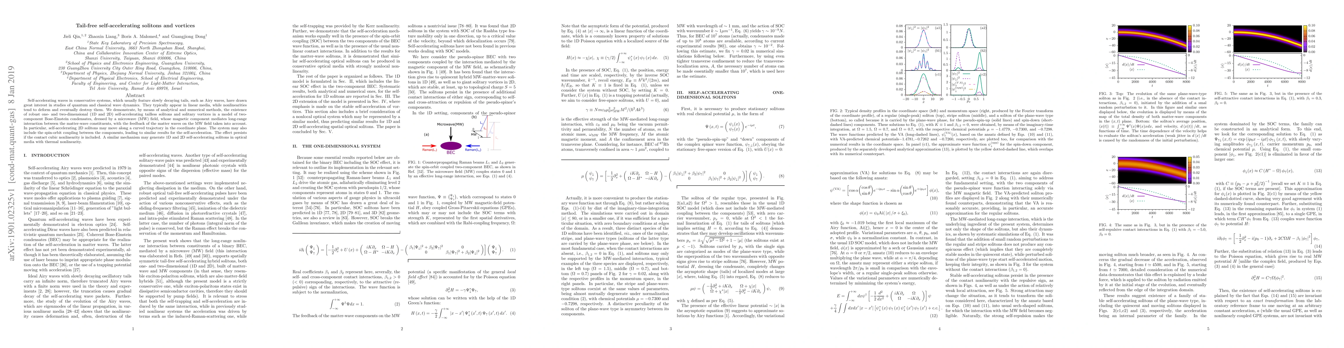 This paper demonstrates the existence of robust, tailless self-accelerating solitons and vortices in two-component Bose-Einstein condensates influenced by microwave fields, showing that nonlinearities can sustain these structures without typical tail decay. The findings suggest similar mechanisms may apply to optical media with thermal nonlinearity.