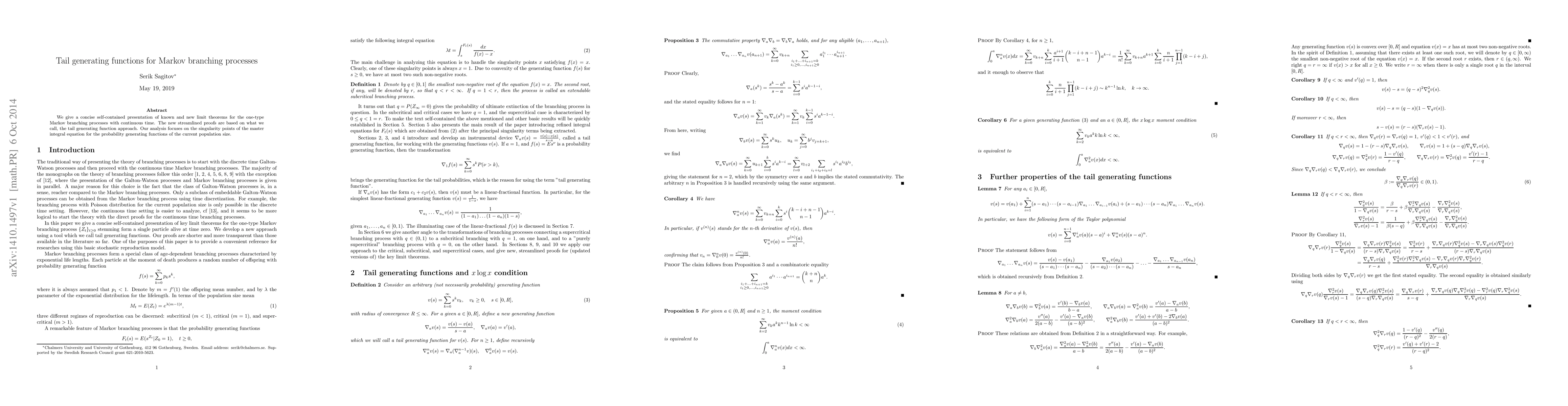 We give a concise self-contained presentation of known and new limit theorems for the one-type Markov branching processes with continuous time. The new streamlined proofs are based on what we call, the tail generating function approach. Our analysis focuses on the singularity points of the master integral equation for the probability generating functions of the current population size.