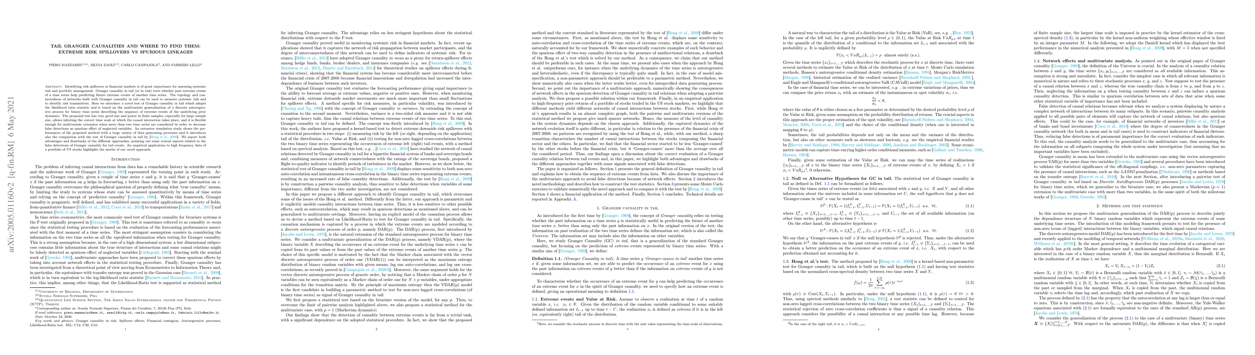 Identifying risk spillovers in financial markets is of great importance for assessing systemic risk and portfolio management. Granger causality in tail (or in risk) tests whether past extreme events of a time series help predicting future extreme events of another time series. The topology and connectedness of networks built with Granger causality in tail can be used to measure systemic risk and to identify risk transmitters. Here we introduce a novel test of Granger causality in tail which adopts the likelihood ratio statistic and is based on the multivariate generalization of a discrete autoregressive process for binary time series describing the sequence of extreme events of the underlying price dynamics. The proposed test has very good size and power in finite samples, especially for large sample size, allows inferring the correct time scale at which the causal interaction takes place, and it is flexible enough for multivariate extension when more than two time series are considered in order to decrease false detections as spurious effect of neglected variables. An extensive simulation study shows the performances of the proposed method with a large variety of data generating processes and it introduces also the comparison with the test of Granger causality in tail by [Hong et al., 2009]. We report both advantages and drawbacks of the different approaches, pointing out some crucial aspects related to the false detections of Granger causality for tail events. An empirical application to high frequency data of a portfolio of US stocks highlights the merits of our novel approach.