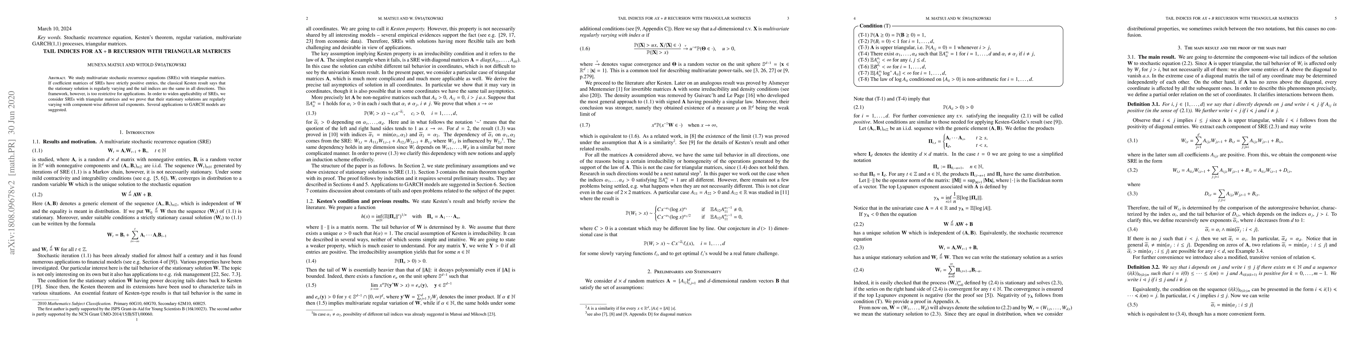 This paper explores multivariate stochastic recurrence equations (SREs) with triangular matrix coefficients, proving that solutions can have regularly varying tails with potentially different tail indices across coordinates, thus broadening the applicability of SREs beyond the strictly positive matrix constraint. Applications to GARCH models are also suggested.