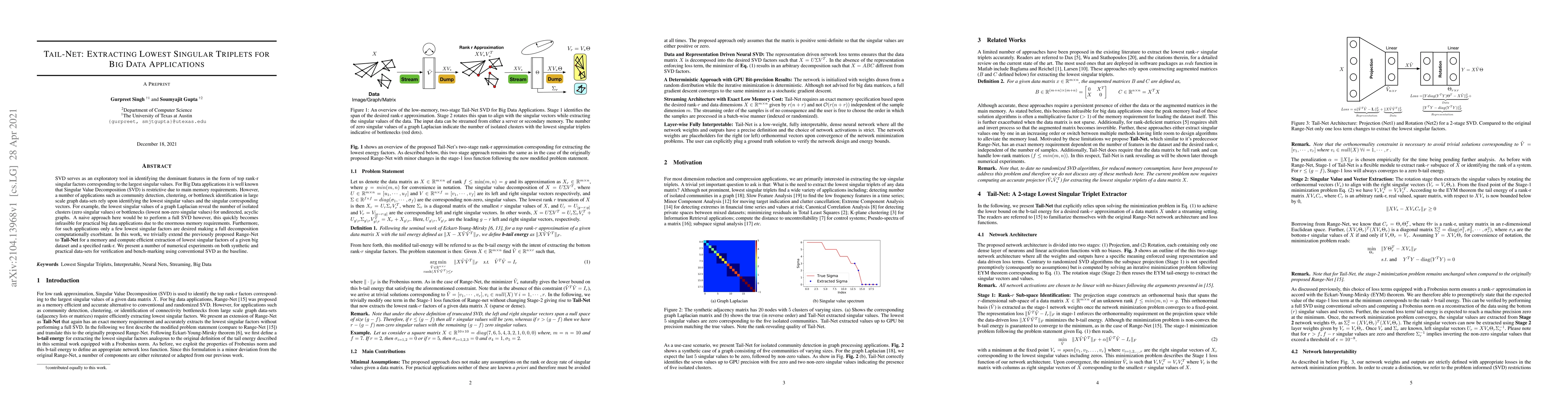 SVD serves as an exploratory tool in identifying the dominant features in the form of top rank-r singular factors corresponding to the largest singular values. For Big Data applications it is well known that Singular Value Decomposition (SVD) is restrictive due to main memory requirements. However, a number of applications such as community detection, clustering, or bottleneck identification in large scale graph data-sets rely upon identifying the lowest singular values and the singular corresponding vectors. For example, the lowest singular values of a graph Laplacian reveal the number of isolated clusters (zero singular values) or bottlenecks (lowest non-zero singular values) for undirected, acyclic graphs. A naive approach here would be to perform a full SVD however, this quickly becomes infeasible for practical big data applications due to the enormous memory requirements. Furthermore, for such applications only a few lowest singular factors are desired making a full decomposition computationally exorbitant. In this work, we trivially extend the previously proposed Range-Net to \textbf{Tail-Net} for a memory and compute efficient extraction of lowest singular factors of a given big dataset and a specified rank-r. We present a number of numerical experiments on both synthetic and practical data-sets for verification and bench-marking using conventional SVD as the baseline.