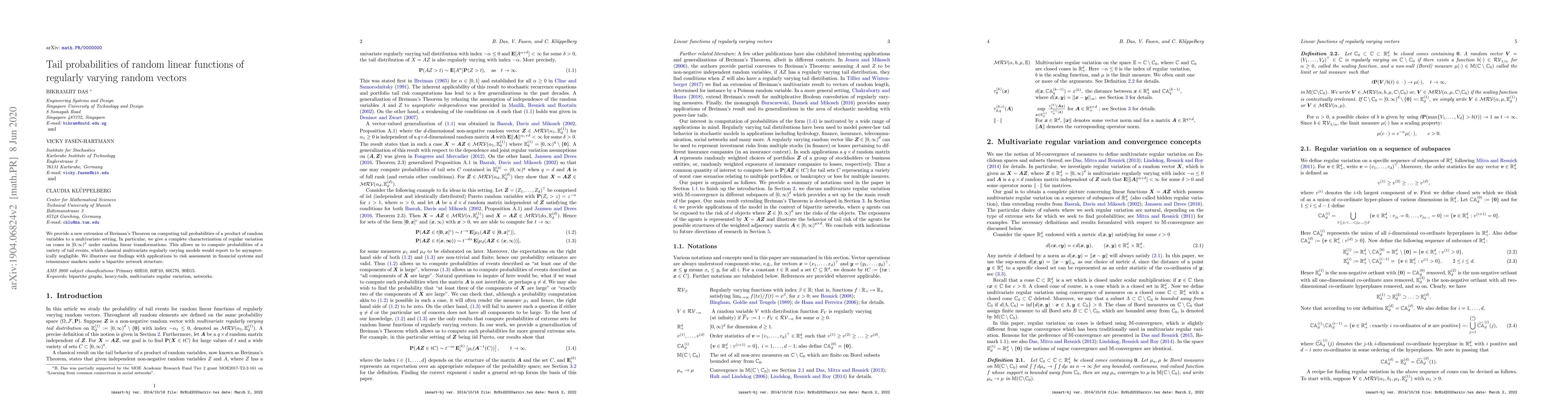This paper extends Breiman's Theorem to compute tail probabilities of random linear functions of multivariate regularly varying random vectors, providing a complete characterization of regular variation under random linear transformations. Applications include risk assessment in financial systems and reinsurance markets.