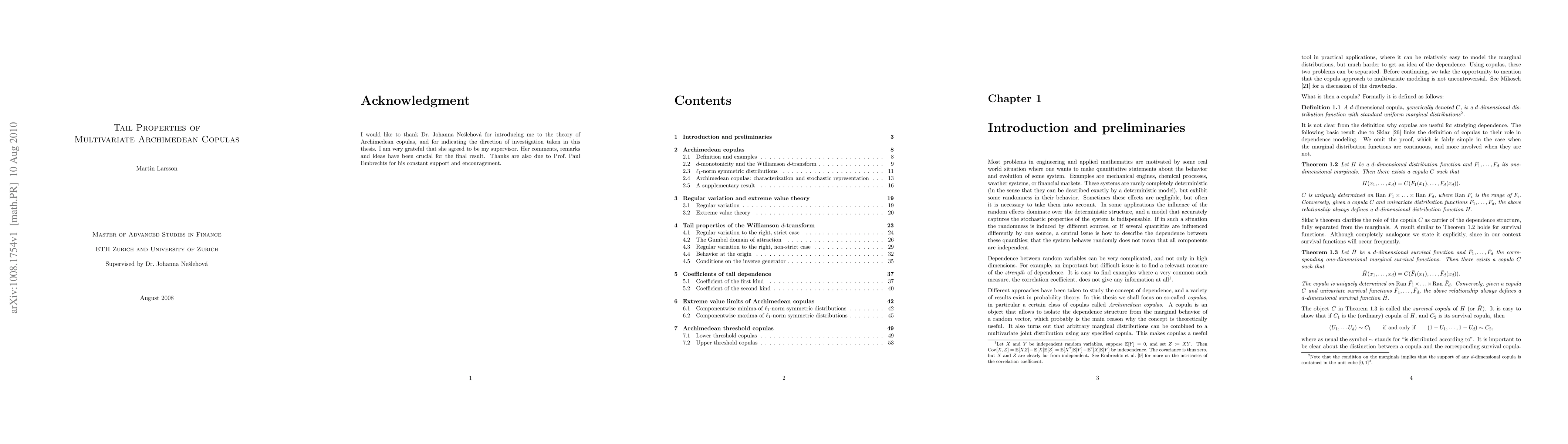 In this thesis, the tail properties of multivariate Archimedean copulas are investigated using known representation theorems involving L1-norm symmetric distributions and the Williamson d-transform. Several new results on the asymptotic properties of the Williamson d-transform are established and subsequently used to study the tails of Archimedean copulas. This makes it possible to recover many known results regarding their tail behavior in a straightforward and transparent way. In particular, coefficients of tail dependence, extreme value limits and threshold copulas are considered. A central theme is the emphasis on the probabilistic aspects of stochastic representations, rather than the analytic aspects of representations involving Archimedean generators.