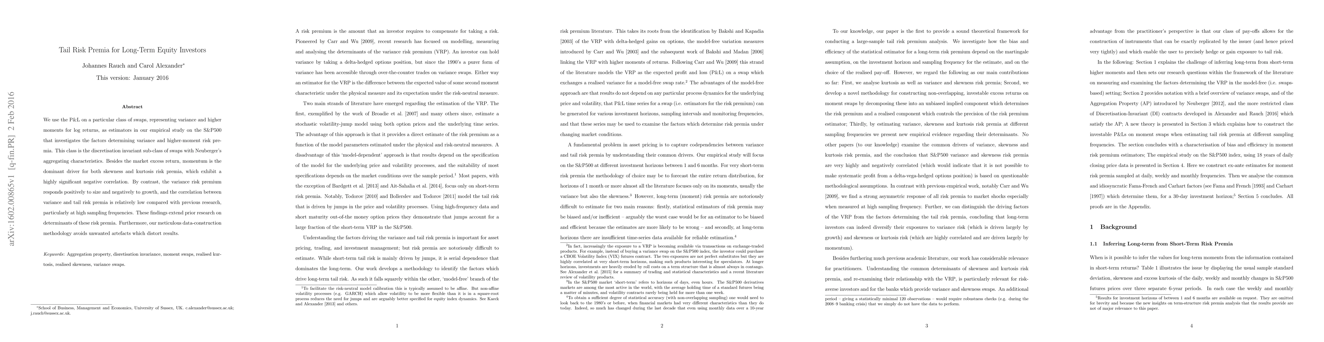 We use the P&L on a particular class of swaps, representing variance and higher moments for log returns, as estimators in our empirical study on the S&P500 that investigates the factors determining variance and higher-moment risk premia. This class is the discretisation invariant sub-class of swaps with Neuberger's aggregating characteristics. Besides the market excess return, momentum is the dominant driver for both skewness and kurtosis risk premia, which exhibit a highly significant negative correlation. By contrast, the variance risk premium responds positively to size and negatively to growth, and the correlation between variance and tail risk premia is relatively low compared with previous research, particularly at high sampling frequencies. These findings extend prior research on determinants of these risk premia. Furthermore, our meticulous data-construction methodology avoids unwanted artefacts which distort results.