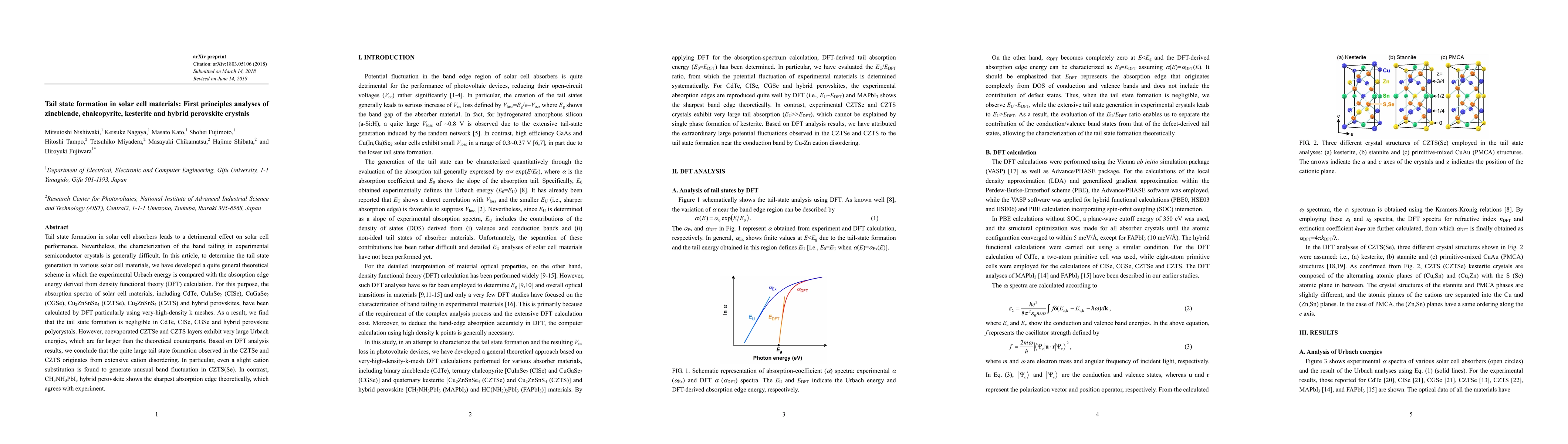 This paper investigates tail state formation in various solar cell materials using density functional theory (DFT) to determine its impact on performance. It finds negligible tail states in CdTe, CISe, CGSe, and hybrid perovskites, but significant tail states in CZTSe and CZTS due to cation disordering, contrasting with the sharp absorption edge in CH3NH3PbI3 hybrid perovskites.