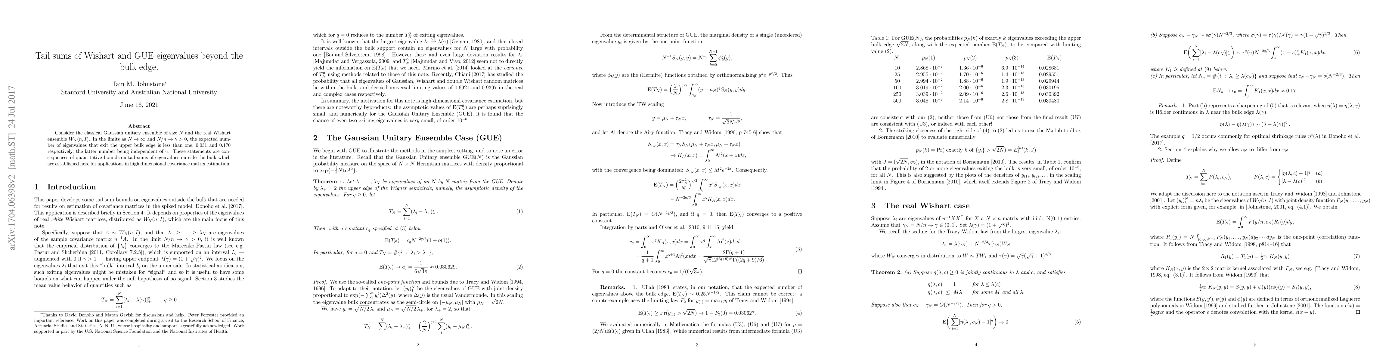 Consider the classical Gaussian unitary ensemble of size $N$ and the real Wishart ensemble $W_N(n,I)$. In the limits as $N \to \infty$ and $N/n \to \gamma > 0$, the expected number of eigenvalues that exit the upper bulk edge is less than one, 0.031 and 0.170 respectively, the latter number being independent of $\gamma$. These statements are consequences of quantitative bounds on tail sums of eigenvalues outside the bulk which are established here for applications in high dimensional covariance matrix estimation.
