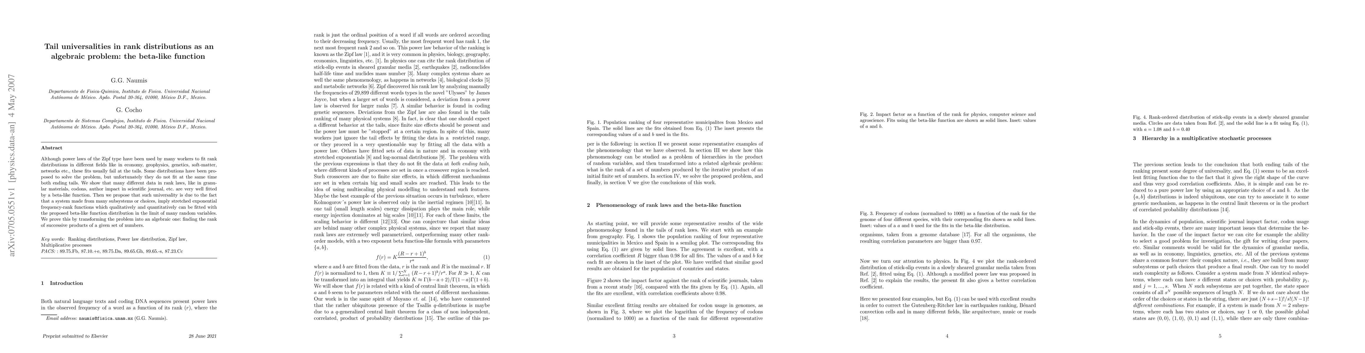 Although power laws of the Zipf type have been used by many workers to fit rank distributions in different fields like in economy, geophysics, genetics, soft-matter, networks etc., these fits usually fail at the tails. Some distributions have been proposed to solve the problem, but unfortunately they do not fit at the same time both ending tails. We show that many different data in rank laws, like in granular materials, codons, author impact in scientific journal, etc. are very well fitted by a beta-like function. Then we propose that such universality is due to the fact that a system made from many subsystems or choices, imply stretched exponential frequency-rank functions which qualitatively and quantitatively can be fitted with the proposed beta-like function distribution in the limit of many random variables. We prove this by transforming the problem into an algebraic one: finding the rank of successive products of a given set of numbers.