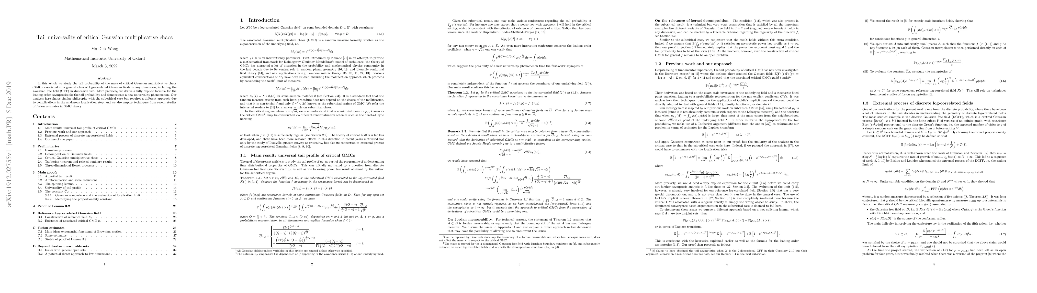 This paper investigates the tail probability of critical Gaussian multiplicative chaos (GMC) linked to log-correlated Gaussian fields, deriving an explicit formula for its leading asymptotics and revealing a new universality phenomenon. The study employs novel techniques to address complications in the localization step, diverging from the subcritical case.