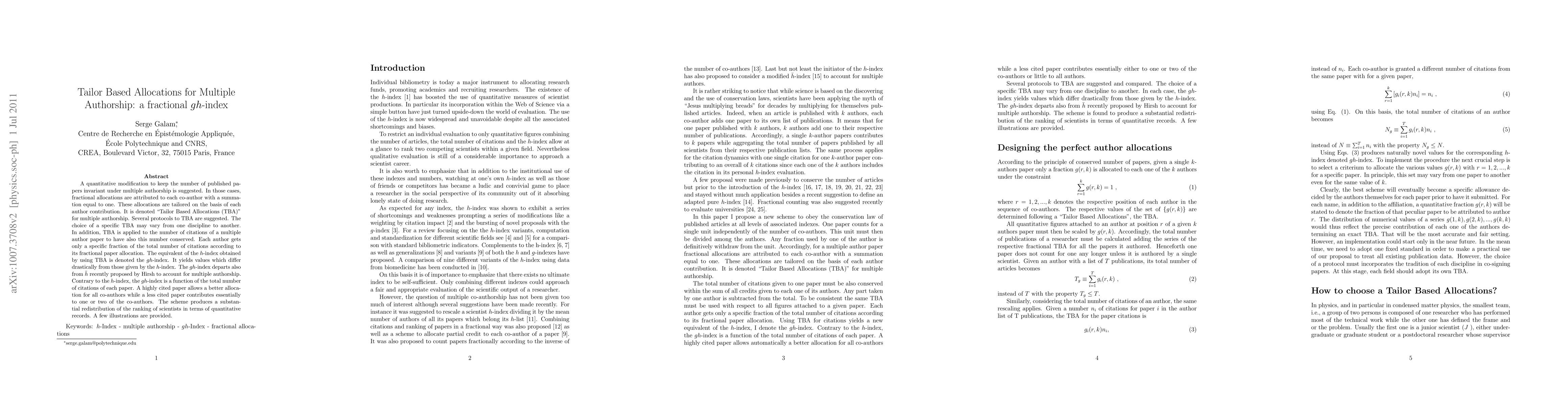 A quantitative modification to keep the number of published papers invariant under multiple authorship is suggested. In those cases, fractional allocations are attributed to each co-author with a summation equal to one. These allocations are tailored on the basis of each author contribution. It is denoted "Tailor Based Allocations (TBA)" for multiple authorship. Several protocols to TBA are suggested. The choice of a specific TBA may vary from one discipline to another. In addition, TBA is applied to the number of citations of a multiple author paper to have also this number conserved. Each author gets only a specific fraction of the total number of citations according to its fractional paper allocation. The equivalent of the h-index obtained by using TBA is denoted the gh-index. It yields values which differ drastically from those given by the h-index. The gh-index departs also from the `h-index recently proposed by Hirsh to account for multiple authorship. Contrary to the h-index, the gh-index is a function of the total number of citations of each paper. A highly cited paper allows a better allocation for all co-authors while a less cited paper contributes essentially to one or two of the co-authors. The scheme produces a substantial redistribution of the ranking of scientists in terms of quantitative records. A few illustrations are provided.