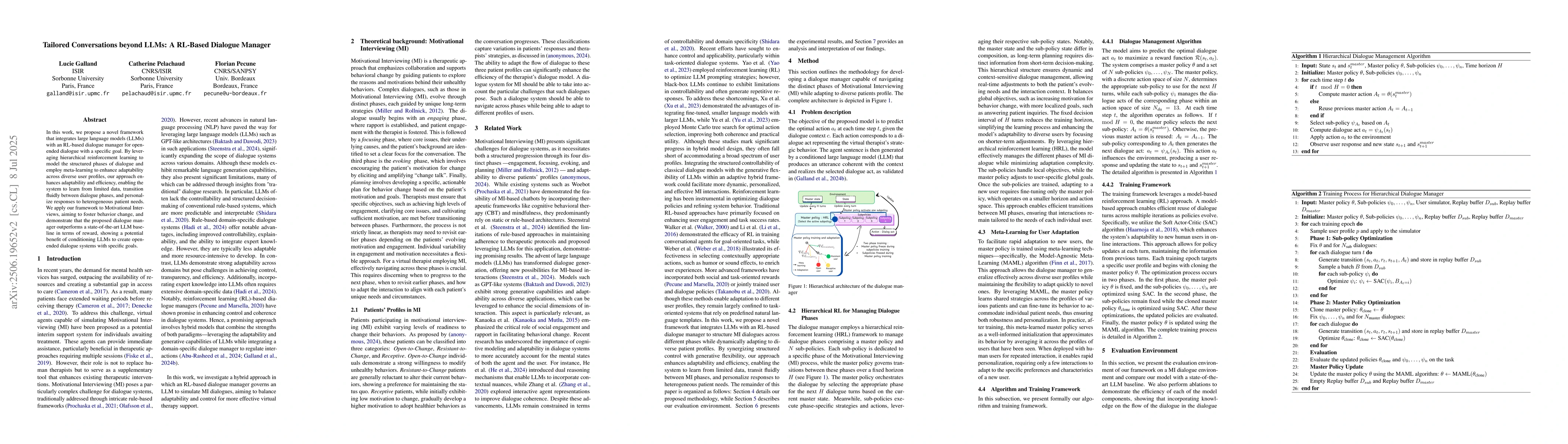 In this work, we propose a novel framework that integrates large language models (LLMs) with an RL-based dialogue manager for open-ended dialogue with a specific goal. By leveraging hierarchical reinforcement learning to model the structured phases of dialogue and employ meta-learning to enhance adaptability across diverse user profiles, our approach enhances adaptability and efficiency, enabling the system to learn from limited data, transition fluidly between dialogue phases, and personalize responses to heterogeneous patient needs. We apply our framework to Motivational Interviews, aiming to foster behavior change, and demonstrate that the proposed dialogue manager outperforms a state-of-the-art LLM baseline in terms of reward, showing a potential benefit of conditioning LLMs to create open-ended dialogue systems with specific goals.