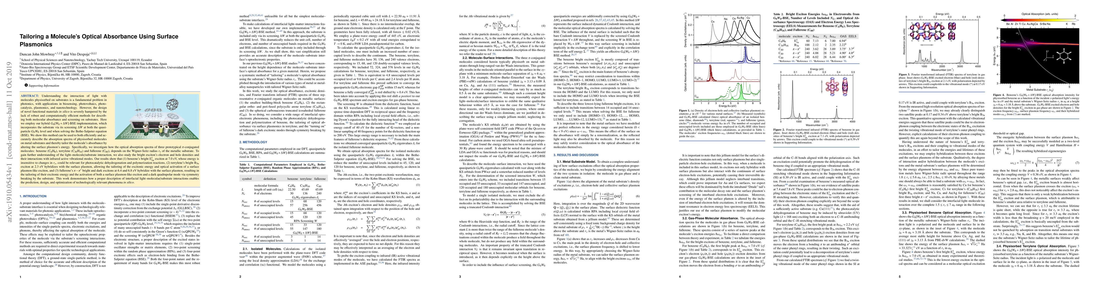 The design of novel functional materials in silico is severely hampered by the lack of robust and computationally efficient methods for describing both molecular absorbance and screening on substrates. Here we employ our hybrid $G_0[W_0+\Delta W]$-BSE implementation, which incorporates the substrate via its screening $\Delta W$ at both the quasiparticle $G_0W_0$ level and when solving the Bethe-Salpeter equation (BSE). We show this method can be used to both efficiently and accurately describe the absorption spectra of physisorbed molecules on metal substrates and thereby tailor the molecule's absorbance by altering the surface plasmon's energy. Specifically, we investigate how the optical absorption spectra of three prototypical $\pi$-conjugated molecules: benzene (C$_6$H$_6$), terrylene (C$_{30}$H$_{16}$) and fullerene (C$_{60}$), depends on the Wigner-Seitz radius $r_s$ of the metallic substrate. To gain further understanding of the light--molecule/substrate interaction, we also study the bright exciton's electron and hole densities and their interactions with infrared active vibrational modes. Our results show that (1) benzene's bright $E_{1u}^1$ exciton at 7.0 eV, whose energy is insensitive to changes in $r_s$, could be relevant for photocatalytic dehydrogenation and polymerization reactions, (2) terrylene's bright $B_{3u}$ exciton at 2.3 eV hybridizes with the surface plasmon, allowing the tailoring of the excitonic energy and optical activation of a surface plasmon-like exciton, and (3) fullerene's $\pi-\pi^*$ bright and dark excitons at 6.4 and 6.8 eV hybridize with the surface plasmon, resulting in the tailoring of their excitonic energy and the activation of both a surface plasmon-like exciton and a dark quadrupolar mode via symmetry breaking by the substrate.