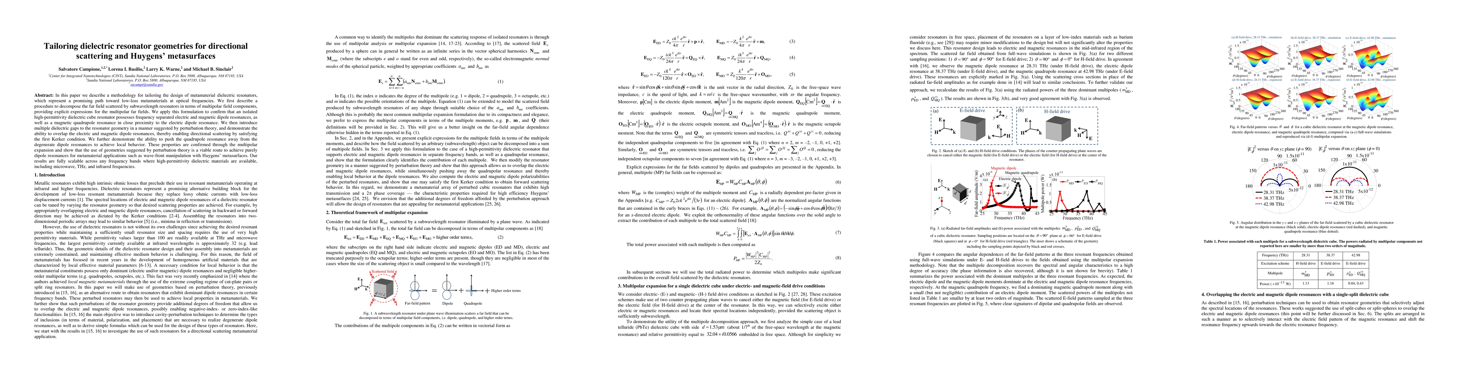 In this paper we describe a methodology for tailoring the design of metamaterial dielectric resonators, which represent a promising path toward low-loss metamaterials at optical frequencies. We first describe a procedure to decompose the far field scattered by subwavelength resonators in terms of multipolar field components, providing explicit expressions for the multipolar far fields. We apply this formulation to confirm that an isolated high-permittivity cube resonator possesses frequency separated electric and magnetic dipole resonances, as well as a magnetic quadrupole resonance in close proximity to the electric dipole resonance. We then introduce multiple dielectric gaps to the resonator geometry in a manner suggested by perturbation theory, and demonstrate the ability to overlap the electric and magnetic dipole resonances, thereby enabling directional scattering by satisfying the first Kerker condition. We further demonstrate the ability to push the quadrupole resonance away from the degenerate dipole resonances to achieve local behavior. These properties are confirmed through the multipolar expansion and show that the use of geometries suggested by perturbation theory is a viable route to achieve purely dipole resonances for metamaterial applications such as wave-front manipulation with Huygens' metasurfaces. Our results are fully scalable across any frequency bands where high-permittivity dielectric materials are available, including microwave, THz, and infrared frequencies.